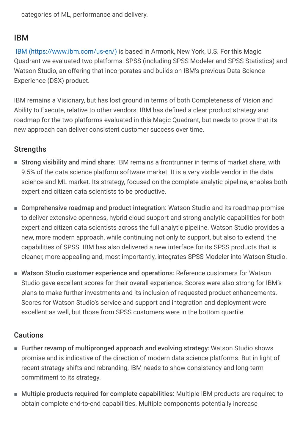 17 . categories of ML, performance and delivery. IBM IBM (https://www.ibm.com/us-en/) is based in Armonk, New York, U.S. For this Magic Quadrant we evaluated two platforms: SPSS (including SPSS Modeler and SPSS Statistics) and Watson Studio, an offering that incorporates and builds on IBM’s previous Data Science Experience (DSX) product. IBM remains a Visionary, but has lost ground in terms of both Completeness of Vision and Ability to Execute, relative to other vendors. IBM has defined a clear product strategy and roadmap for the two platforms evaluated in this Magic Quadrant, but needs to prove that its new approach can deliver consistent customer success over time. Strengths ■ Strong visibility and mind share: IBM remains a frontrunner in terms of market share, with 9.5% of the data science platform software market. It is a very visible vendor in the data science and ML market. Its strategy, focused on the complete analytic pipeline, enables both expert and citizen data scientists to be productive. ■ Comprehensive roadmap and product integration: Watson Studio and its roadmap promise to deliver extensive openness, hybrid cloud support and strong analytic capabilities for both expert and citizen data scientists across the full analytic pipeline. Watson Studio provides a new, more modern approach, while continuing not only to support, but also to extend, the capabilities of SPSS. IBM has also delivered a new interface for its SPSS products that is cleaner, more appealing and, most importantly, integrates SPSS Modeler into Watson Studio. ■ Watson Studio customer experience and operations: Reference customers for Watson Studio gave excellent scores for their overall experience. Scores were also strong for IBM’s plans to make further investments and its inclusion of requested product enhancements. Scores for Watson Studio’s service and support and integration and deployment were excellent as well, but those from SPSS customers were in the bottom quartile. Cautions ■ Further revamp of multipronged approach and evolving strategy: Watson Studio shows promise and is indicative of the direction of modern data science platforms. But in light of recent strategy shifts and rebranding, IBM needs to show consistency and long-term commitment to its strategy. ■ Multiple products required for complete capabilities: Multiple IBM products are required to obtain complete end-to-end capabilities. Multiple components potentially increase