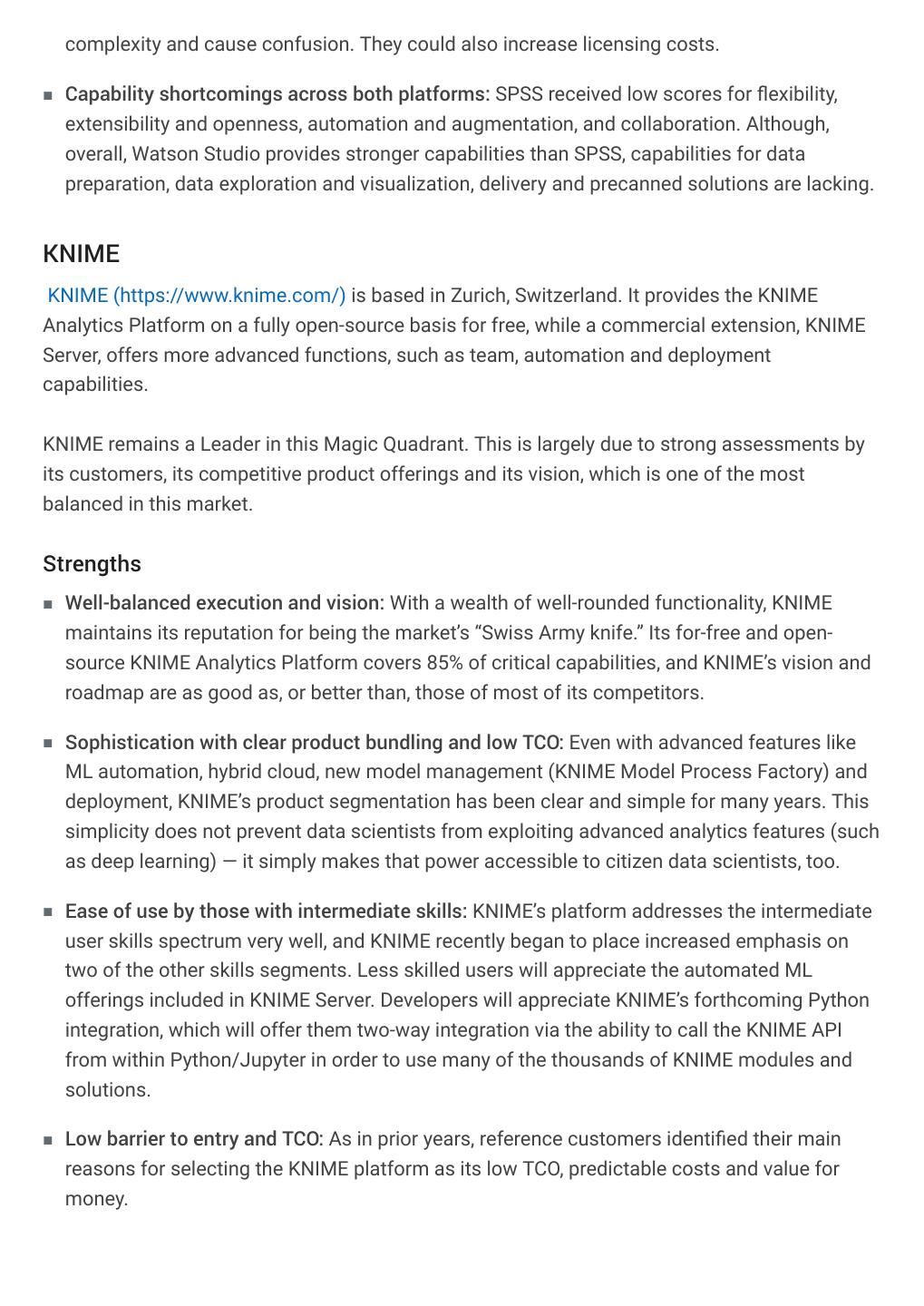 18 . complexity and cause confusion. They could also increase licensing costs. ■ Capability shortcomings across both platforms: SPSS received low scores for flexibility, extensibility and openness, automation and augmentation, and collaboration. Although, overall, Watson Studio provides stronger capabilities than SPSS, capabilities for data preparation, data exploration and visualization, delivery and precanned solutions are lacking. KNIME KNIME (https://www.knime.com/) is based in Zurich, Switzerland. It provides the KNIME Analytics Platform on a fully open-source basis for free, while a commercial extension, KNIME Server, offers more advanced functions, such as team, automation and deployment capabilities. KNIME remains a Leader in this Magic Quadrant. This is largely due to strong assessments by its customers, its competitive product offerings and its vision, which is one of the most balanced in this market. Strengths ■ Well-balanced execution and vision: With a wealth of well-rounded functionality, KNIME maintains its reputation for being the market’s “Swiss Army knife.” Its for-free and open- source KNIME Analytics Platform covers 85% of critical capabilities, and KNIME’s vision and roadmap are as good as, or better than, those of most of its competitors. ■ Sophistication with clear product bundling and low TCO: Even with advanced features like ML automation, hybrid cloud, new model management (KNIME Model Process Factory) and deployment, KNIME’s product segmentation has been clear and simple for many years. This simplicity does not prevent data scientists from exploiting advanced analytics features (such as deep learning) — it simply makes that power accessible to citizen data scientists, too. ■ Ease of use by those with intermediate skills: KNIME’s platform addresses the intermediate user skills spectrum very well, and KNIME recently began to place increased emphasis on two of the other skills segments. Less skilled users will appreciate the automated ML offerings included in KNIME Server. Developers will appreciate KNIME’s forthcoming Python integration, which will offer them two-way integration via the ability to call the KNIME API from within Python/Jupyter in order to use many of the thousands of KNIME modules and solutions. ■ Low barrier to entry and TCO: As in prior years, reference customers identified their main reasons for selecting the KNIME platform as its low TCO, predictable costs and value for money.