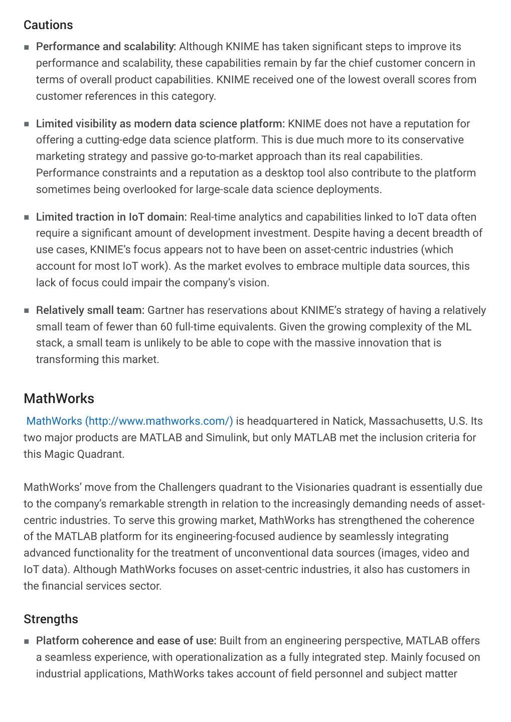 19 .Cautions ■ Performance and scalability: Although KNIME has taken significant steps to improve its performance and scalability, these capabilities remain by far the chief customer concern in terms of overall product capabilities. KNIME received one of the lowest overall scores from customer references in this category. ■ Limited visibility as modern data science platform: KNIME does not have a reputation for offering a cutting-edge data science platform. This is due much more to its conservative marketing strategy and passive go-to-market approach than its real capabilities. Performance constraints and a reputation as a desktop tool also contribute to the platform sometimes being overlooked for large-scale data science deployments. ■ Limited traction in IoT domain: Real-time analytics and capabilities linked to IoT data often require a significant amount of development investment. Despite having a decent breadth of use cases, KNIME’s focus appears not to have been on asset-centric industries (which account for most IoT work). As the market evolves to embrace multiple data sources, this lack of focus could impair the company’s vision. ■ Relatively small team: Gartner has reservations about KNIME’s strategy of having a relatively small team of fewer than 60 full-time equivalents. Given the growing complexity of the ML stack, a small team is unlikely to be able to cope with the massive innovation that is transforming this market. MathWorks MathWorks (http://www.mathworks.com/) is headquartered in Natick, Massachusetts, U.S. Its two major products are MATLAB and Simulink, but only MATLAB met the inclusion criteria for this Magic Quadrant. MathWorks’ move from the Challengers quadrant to the Visionaries quadrant is essentially due to the company’s remarkable strength in relation to the increasingly demanding needs of asset- centric industries. To serve this growing market, MathWorks has strengthened the coherence of the MATLAB platform for its engineering-focused audience by seamlessly integrating advanced functionality for the treatment of unconventional data sources (images, video and IoT data). Although MathWorks focuses on asset-centric industries, it also has customers in the financial services sector. Strengths ■ Platform coherence and ease of use: Built from an engineering perspective, MATLAB offers a seamless experience, with operationalization as a fully integrated step. Mainly focused on industrial applications, MathWorks takes account of field personnel and subject matter
