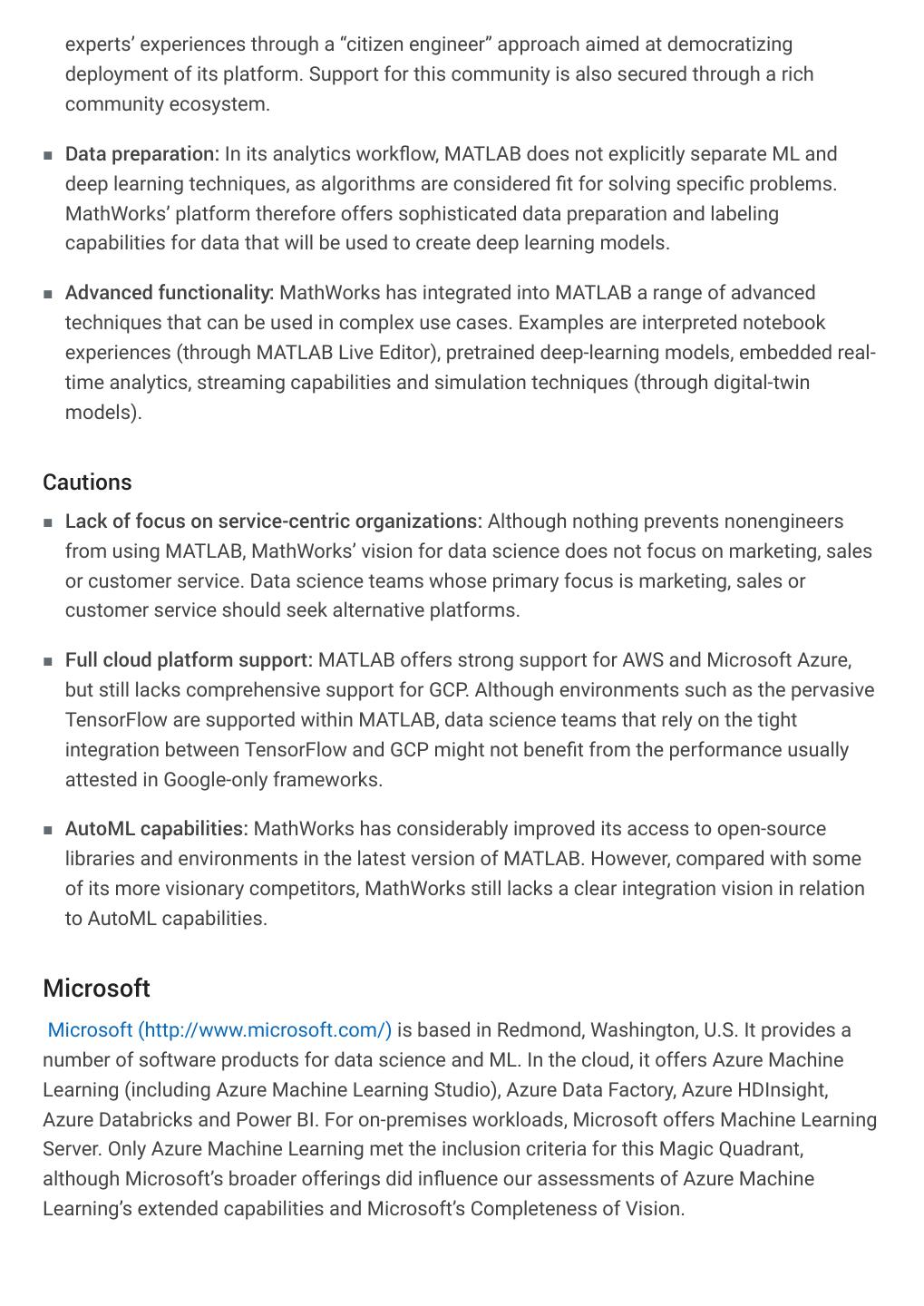 20 . experts’ experiences through a “citizen engineer” approach aimed at democratizing deployment of its platform. Support for this community is also secured through a rich community ecosystem. ■ Data preparation: In its analytics workflow, MATLAB does not explicitly separate ML and deep learning techniques, as algorithms are considered fit for solving specific problems. MathWorks’ platform therefore offers sophisticated data preparation and labeling capabilities for data that will be used to create deep learning models. ■ Advanced functionality: MathWorks has integrated into MATLAB a range of advanced techniques that can be used in complex use cases. Examples are interpreted notebook experiences (through MATLAB Live Editor), pretrained deep-learning models, embedded real- time analytics, streaming capabilities and simulation techniques (through digital-twin models). Cautions ■ Lack of focus on service-centric organizations: Although nothing prevents nonengineers from using MATLAB, MathWorks’ vision for data science does not focus on marketing, sales or customer service. Data science teams whose primary focus is marketing, sales or customer service should seek alternative platforms. ■ Full cloud platform support: MATLAB offers strong support for AWS and Microsoft Azure, but still lacks comprehensive support for GCP. Although environments such as the pervasive TensorFlow are supported within MATLAB, data science teams that rely on the tight integration between TensorFlow and GCP might not benefit from the performance usually attested in Google-only frameworks. ■ AutoML capabilities: MathWorks has considerably improved its access to open-source libraries and environments in the latest version of MATLAB. However, compared with some of its more visionary competitors, MathWorks still lacks a clear integration vision in relation to AutoML capabilities. Microsoft Microsoft (http://www.microsoft.com/) is based in Redmond, Washington, U.S. It provides a number of software products for data science and ML. In the cloud, it offers Azure Machine Learning (including Azure Machine Learning Studio), Azure Data Factory, Azure HDInsight, Azure Databricks and Power BI. For on-premises workloads, Microsoft offers Machine Learning Server. Only Azure Machine Learning met the inclusion criteria for this Magic Quadrant, although Microsoft’s broader offerings did influence our assessments of Azure Machine Learning’s extended capabilities and Microsoft’s Completeness of Vision.
