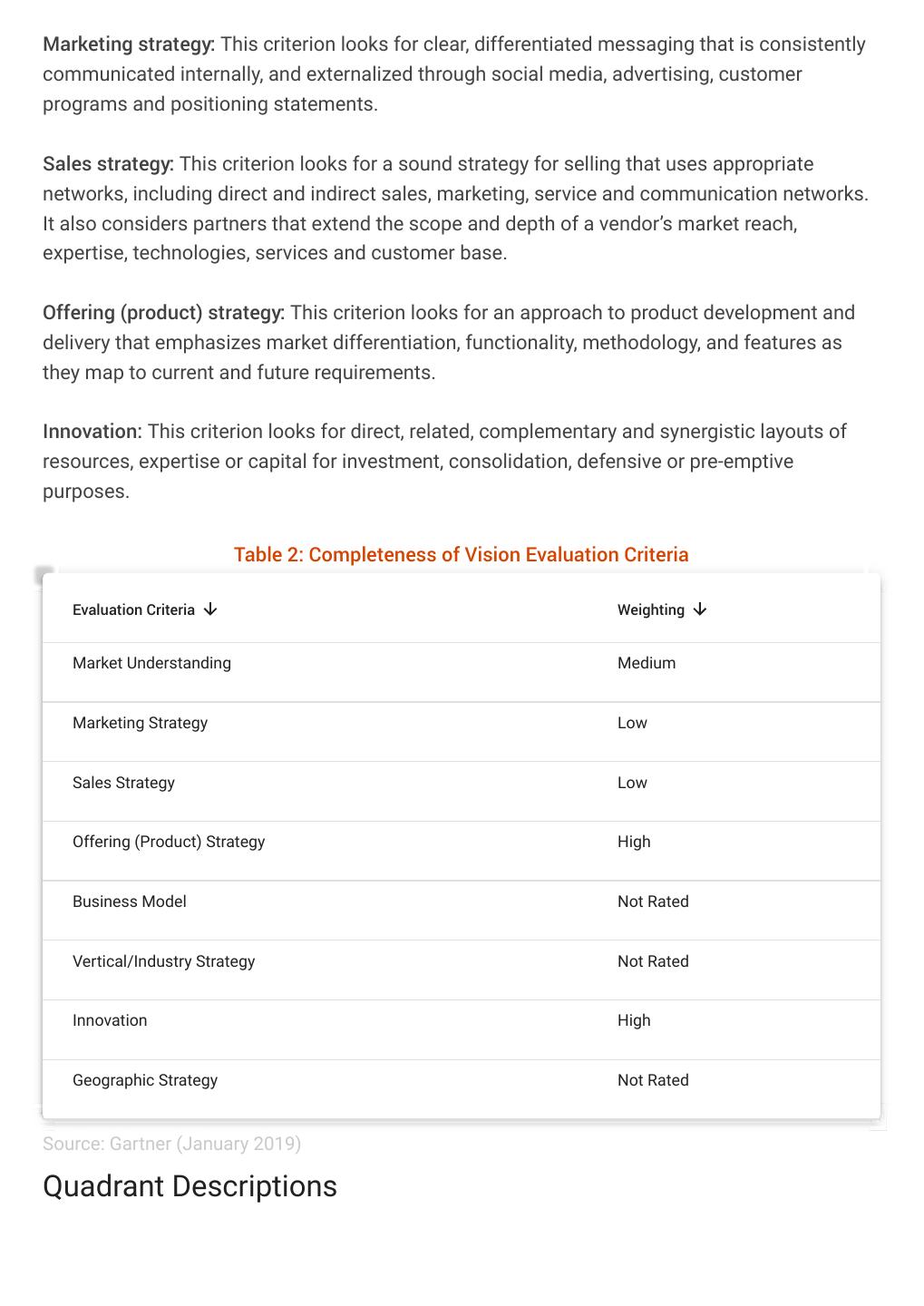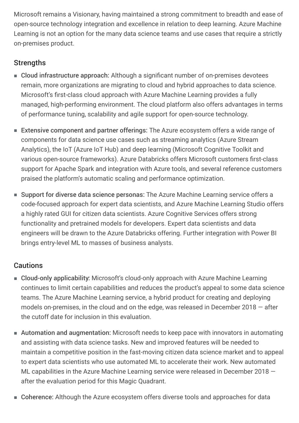 21 .Microsoft remains a Visionary, having maintained a strong commitment to breadth and ease of open-source technology integration and excellence in relation to deep learning. Azure Machine Learning is not an option for the many data science teams and use cases that require a strictly on-premises product. Strengths ■ Cloud infrastructure approach: Although a significant number of on-premises devotees remain, more organizations are migrating to cloud and hybrid approaches to data science. Microsoft’s first-class cloud approach with Azure Machine Learning provides a fully managed, high-performing environment. The cloud platform also offers advantages in terms of performance tuning, scalability and agile support for open-source technology. ■ Extensive component and partner offerings: The Azure ecosystem offers a wide range of components for data science use cases such as streaming analytics (Azure Stream Analytics), the IoT (Azure IoT Hub) and deep learning (Microsoft Cognitive Toolkit and various open-source frameworks). Azure Databricks offers Microsoft customers first-class support for Apache Spark and integration with Azure tools, and several reference customers praised the platform’s automatic scaling and performance optimization. ■ Support for diverse data science personas: The Azure Machine Learning service offers a code-focused approach for expert data scientists, and Azure Machine Learning Studio offers a highly rated GUI for citizen data scientists. Azure Cognitive Services offers strong functionality and pretrained models for developers. Expert data scientists and data engineers will be drawn to the Azure Databricks offering. Further integration with Power BI brings entry-level ML to masses of business analysts. Cautions ■ Cloud-only applicability: Microsoft’s cloud-only approach with Azure Machine Learning continues to limit certain capabilities and reduces the product’s appeal to some data science teams. The Azure Machine Learning service, a hybrid product for creating and deploying models on-premises, in the cloud and on the edge, was released in December 2018 — after the cutoff date for inclusion in this evaluation. ■ Automation and augmentation: Microsoft needs to keep pace with innovators in automating and assisting with data science tasks. New and improved features will be needed to maintain a competitive position in the fast-moving citizen data science market and to appeal to expert data scientists who use automated ML to accelerate their work. New automated ML capabilities in the Azure Machine Learning service were released in December 2018 — after the evaluation period for this Magic Quadrant. ■ Coherence: Although the Azure ecosystem offers diverse tools and approaches for data
