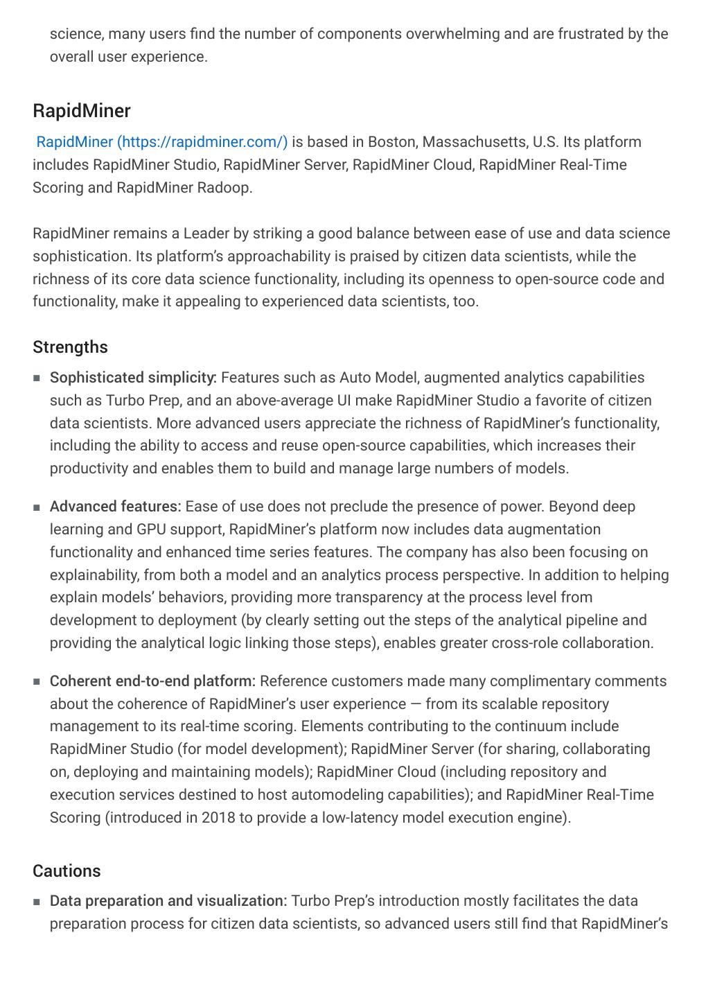 22 . science, many users find the number of components overwhelming and are frustrated by the overall user experience. RapidMiner RapidMiner (https://rapidminer.com/) is based in Boston, Massachusetts, U.S. Its platform includes RapidMiner Studio, RapidMiner Server, RapidMiner Cloud, RapidMiner Real-Time Scoring and RapidMiner Radoop. RapidMiner remains a Leader by striking a good balance between ease of use and data science sophistication. Its platform’s approachability is praised by citizen data scientists, while the richness of its core data science functionality, including its openness to open-source code and functionality, make it appealing to experienced data scientists, too. Strengths ■ Sophisticated simplicity: Features such as Auto Model, augmented analytics capabilities such as Turbo Prep, and an above-average UI make RapidMiner Studio a favorite of citizen data scientists. More advanced users appreciate the richness of RapidMiner’s functionality, including the ability to access and reuse open-source capabilities, which increases their productivity and enables them to build and manage large numbers of models. ■ Advanced features: Ease of use does not preclude the presence of power. Beyond deep learning and GPU support, RapidMiner’s platform now includes data augmentation functionality and enhanced time series features. The company has also been focusing on explainability, from both a model and an analytics process perspective. In addition to helping explain models’ behaviors, providing more transparency at the process level from development to deployment (by clearly setting out the steps of the analytical pipeline and providing the analytical logic linking those steps), enables greater cross-role collaboration. ■ Coherent end-to-end platform: Reference customers made many complimentary comments about the coherence of RapidMiner’s user experience — from its scalable repository management to its real-time scoring. Elements contributing to the continuum include RapidMiner Studio (for model development); RapidMiner Server (for sharing, collaborating on, deploying and maintaining models); RapidMiner Cloud (including repository and execution services destined to host automodeling capabilities); and RapidMiner Real-Time Scoring (introduced in 2018 to provide a low-latency model execution engine). Cautions ■ Data preparation and visualization: Turbo Prep’s introduction mostly facilitates the data preparation process for citizen data scientists, so advanced users still find that RapidMiner’s