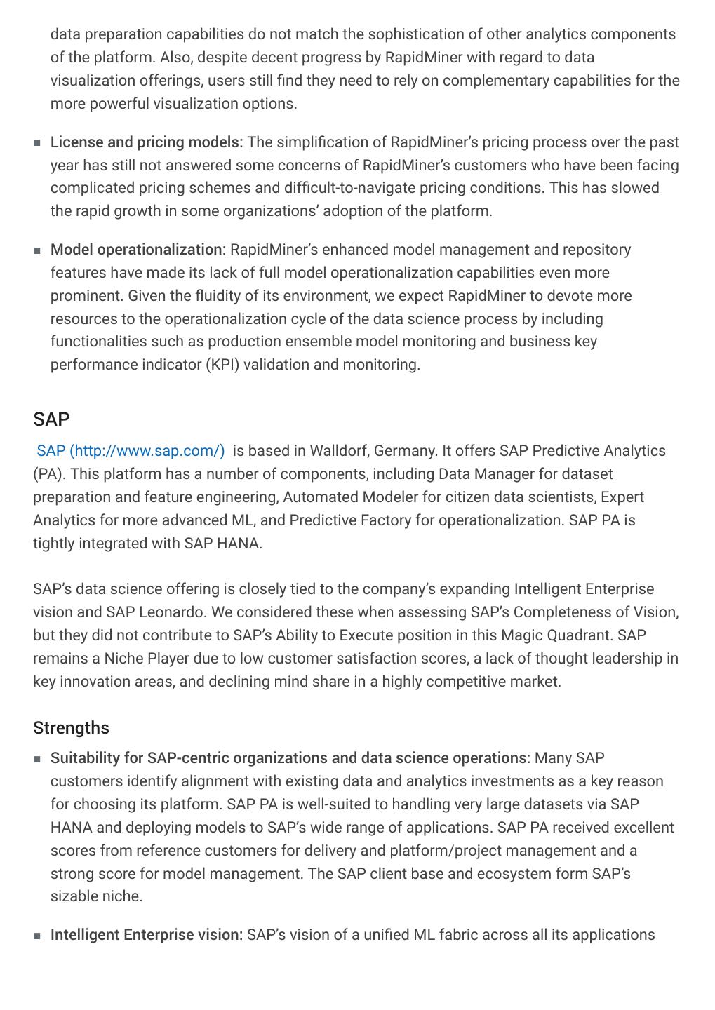 23 . data preparation capabilities do not match the sophistication of other analytics components of the platform. Also, despite decent progress by RapidMiner with regard to data visualization offerings, users still find they need to rely on complementary capabilities for the more powerful visualization options. ■ License and pricing models: The simplification of RapidMiner’s pricing process over the past year has still not answered some concerns of RapidMiner’s customers who have been facing complicated pricing schemes and difficult-to-navigate pricing conditions. This has slowed the rapid growth in some organizations’ adoption of the platform. ■ Model operationalization: RapidMiner’s enhanced model management and repository features have made its lack of full model operationalization capabilities even more prominent. Given the fluidity of its environment, we expect RapidMiner to devote more resources to the operationalization cycle of the data science process by including functionalities such as production ensemble model monitoring and business key performance indicator (KPI) validation and monitoring. SAP SAP (http://www.sap.com/) is based in Walldorf, Germany. It offers SAP Predictive Analytics (PA). This platform has a number of components, including Data Manager for dataset preparation and feature engineering, Automated Modeler for citizen data scientists, Expert Analytics for more advanced ML, and Predictive Factory for operationalization. SAP PA is tightly integrated with SAP HANA. SAP’s data science offering is closely tied to the company’s expanding Intelligent Enterprise vision and SAP Leonardo. We considered these when assessing SAP’s Completeness of Vision, but they did not contribute to SAP’s Ability to Execute position in this Magic Quadrant. SAP remains a Niche Player due to low customer satisfaction scores, a lack of thought leadership in key innovation areas, and declining mind share in a highly competitive market. Strengths ■ Suitability for SAP-centric organizations and data science operations: Many SAP customers identify alignment with existing data and analytics investments as a key reason for choosing its platform. SAP PA is well-suited to handling very large datasets via SAP HANA and deploying models to SAP’s wide range of applications. SAP PA received excellent scores from reference customers for delivery and platform/project management and a strong score for model management. The SAP client base and ecosystem form SAP’s sizable niche. ■ Intelligent Enterprise vision: SAP’s vision of a unified ML fabric across all its applications