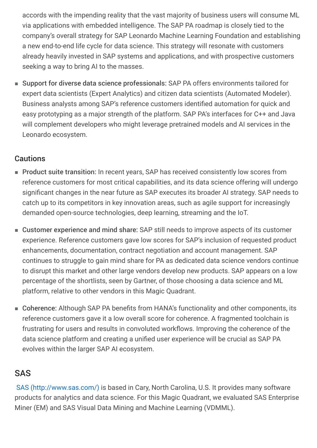 24 . accords with the impending reality that the vast majority of business users will consume ML via applications with embedded intelligence. The SAP PA roadmap is closely tied to the company’s overall strategy for SAP Leonardo Machine Learning Foundation and establishing a new end-to-end life cycle for data science. This strategy will resonate with customers already heavily invested in SAP systems and applications, and with prospective customers seeking a way to bring AI to the masses. ■ Support for diverse data science professionals: SAP PA offers environments tailored for expert data scientists (Expert Analytics) and citizen data scientists (Automated Modeler). Business analysts among SAP’s reference customers identified automation for quick and easy prototyping as a major strength of the platform. SAP PA’s interfaces for C++ and Java will complement developers who might leverage pretrained models and AI services in the Leonardo ecosystem. Cautions ■ Product suite transition: In recent years, SAP has received consistently low scores from reference customers for most critical capabilities, and its data science offering will undergo significant changes in the near future as SAP executes its broader AI strategy. SAP needs to catch up to its competitors in key innovation areas, such as agile support for increasingly demanded open-source technologies, deep learning, streaming and the IoT. ■ Customer experience and mind share: SAP still needs to improve aspects of its customer experience. Reference customers gave low scores for SAP’s inclusion of requested product enhancements, documentation, contract negotiation and account management. SAP continues to struggle to gain mind share for PA as dedicated data science vendors continue to disrupt this market and other large vendors develop new products. SAP appears on a low percentage of the shortlists, seen by Gartner, of those choosing a data science and ML platform, relative to other vendors in this Magic Quadrant. ■ Coherence: Although SAP PA benefits from HANA’s functionality and other components, its reference customers gave it a low overall score for coherence. A fragmented toolchain is frustrating for users and results in convoluted workflows. Improving the coherence of the data science platform and creating a unified user experience will be crucial as SAP PA evolves within the larger SAP AI ecosystem. SAS SAS (http://www.sas.com/) is based in Cary, North Carolina, U.S. It provides many software products for analytics and data science. For this Magic Quadrant, we evaluated SAS Enterprise Miner (EM) and SAS Visual Data Mining and Machine Learning (VDMML).
