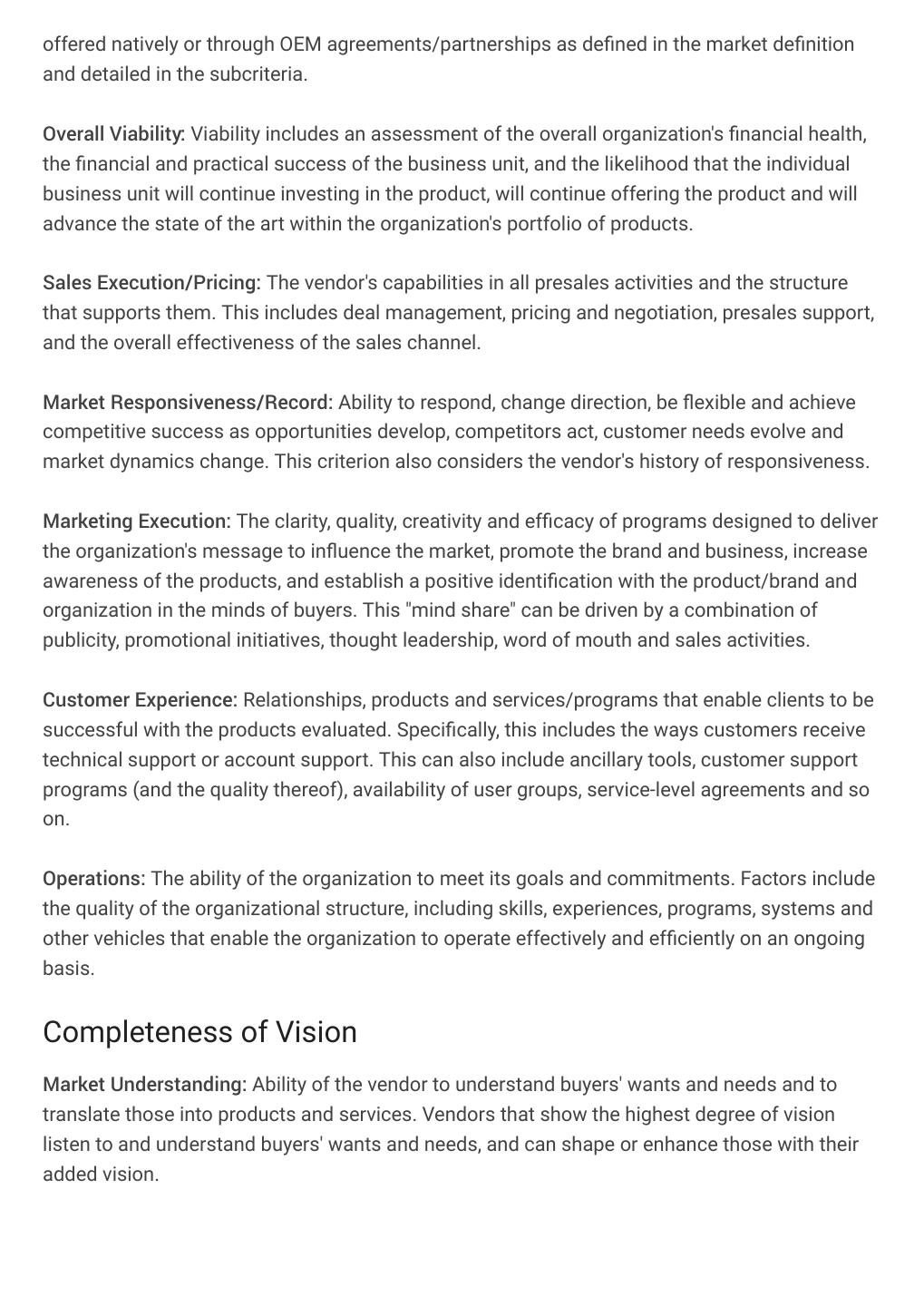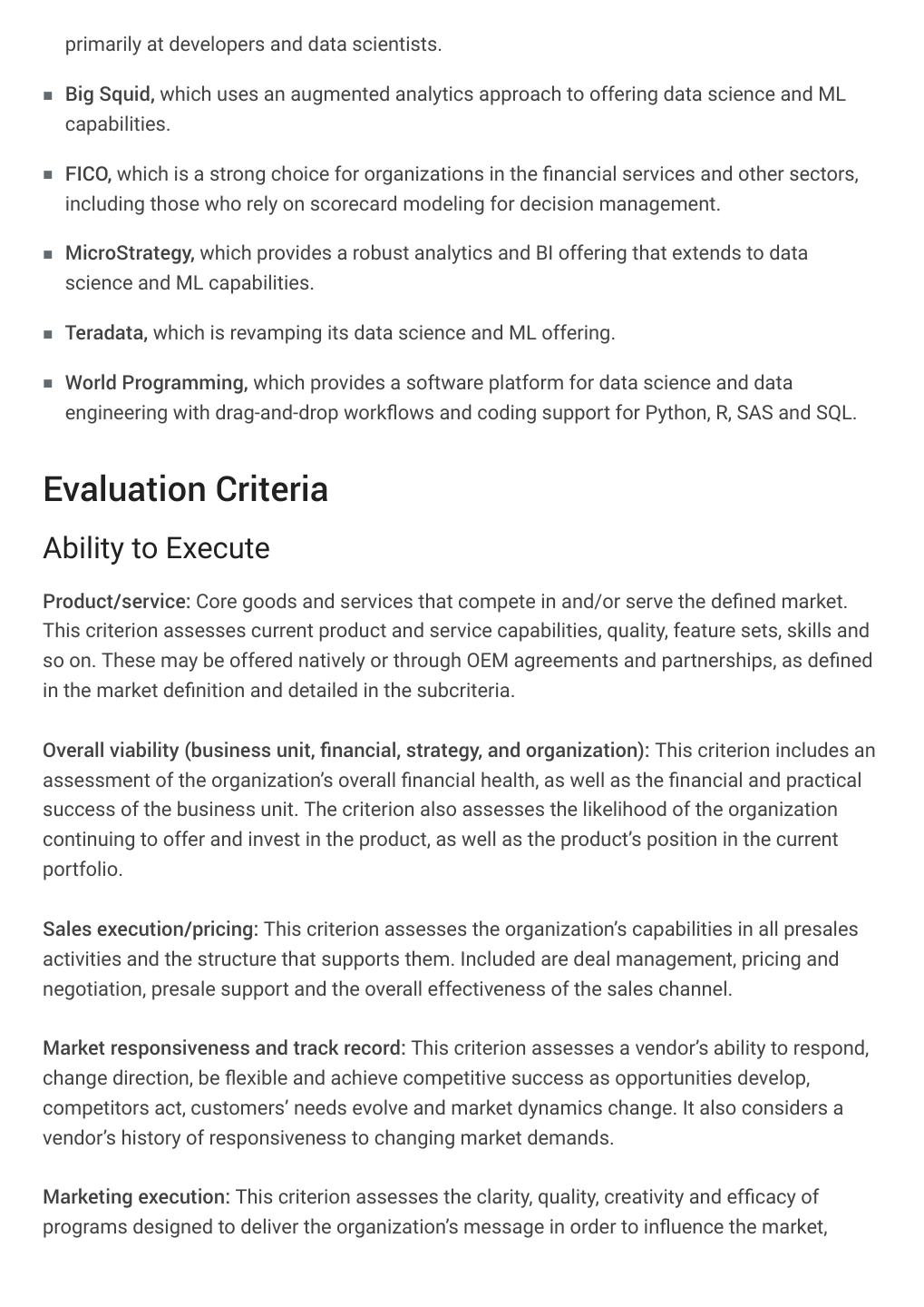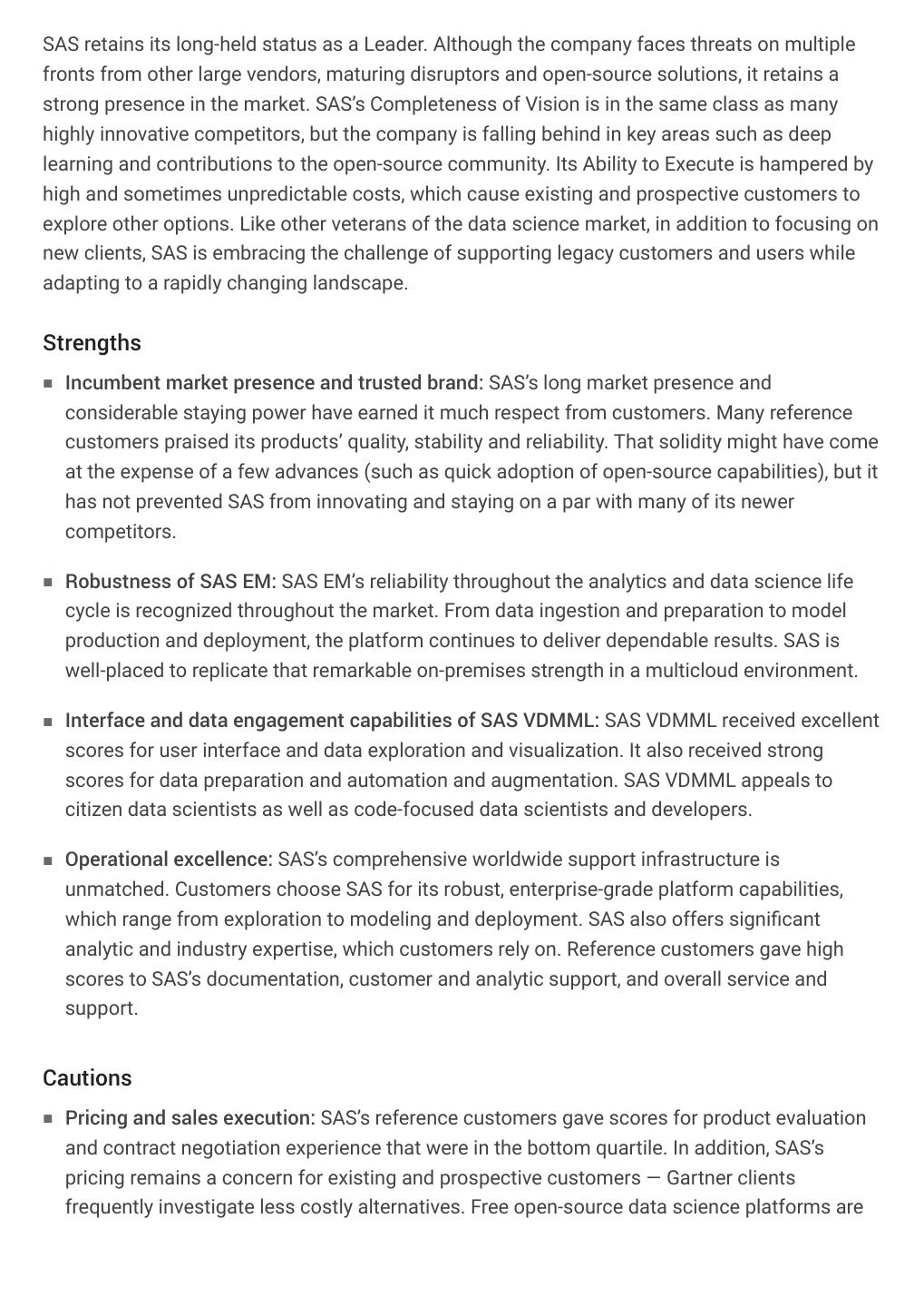 25 .SAS retains its long-held status as a Leader. Although the company faces threats on multiple fronts from other large vendors, maturing disruptors and open-source solutions, it retains a strong presence in the market. SAS’s Completeness of Vision is in the same class as many highly innovative competitors, but the company is falling behind in key areas such as deep learning and contributions to the open-source community. Its Ability to Execute is hampered by high and sometimes unpredictable costs, which cause existing and prospective customers to explore other options. Like other veterans of the data science market, in addition to focusing on new clients, SAS is embracing the challenge of supporting legacy customers and users while adapting to a rapidly changing landscape. Strengths ■ Incumbent market presence and trusted brand: SAS’s long market presence and considerable staying power have earned it much respect from customers. Many reference customers praised its products’ quality, stability and reliability. That solidity might have come at the expense of a few advances (such as quick adoption of open-source capabilities), but it has not prevented SAS from innovating and staying on a par with many of its newer competitors. ■ Robustness of SAS EM: SAS EM’s reliability throughout the analytics and data science life cycle is recognized throughout the market. From data ingestion and preparation to model production and deployment, the platform continues to deliver dependable results. SAS is well-placed to replicate that remarkable on-premises strength in a multicloud environment. ■ Interface and data engagement capabilities of SAS VDMML: SAS VDMML received excellent scores for user interface and data exploration and visualization. It also received strong scores for data preparation and automation and augmentation. SAS VDMML appeals to citizen data scientists as well as code-focused data scientists and developers. ■ Operational excellence: SAS’s comprehensive worldwide support infrastructure is unmatched. Customers choose SAS for its robust, enterprise-grade platform capabilities, which range from exploration to modeling and deployment. SAS also offers significant analytic and industry expertise, which customers rely on. Reference customers gave high scores to SAS’s documentation, customer and analytic support, and overall service and support. Cautions ■ Pricing and sales execution: SAS’s reference customers gave scores for product evaluation and contract negotiation experience that were in the bottom quartile. In addition, SAS’s pricing remains a concern for existing and prospective customers — Gartner clients frequently investigate less costly alternatives. Free open-source data science platforms are