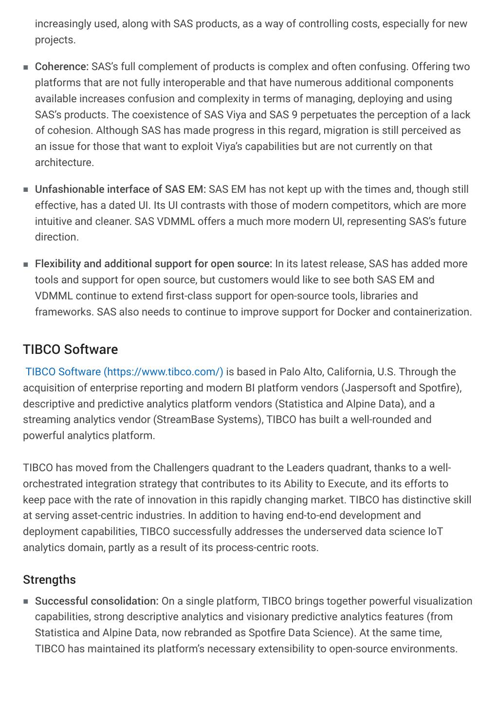 26 . increasingly used, along with SAS products, as a way of controlling costs, especially for new projects. ■ Coherence: SAS’s full complement of products is complex and often confusing. Offering two platforms that are not fully interoperable and that have numerous additional components available increases confusion and complexity in terms of managing, deploying and using SAS’s products. The coexistence of SAS Viya and SAS 9 perpetuates the perception of a lack of cohesion. Although SAS has made progress in this regard, migration is still perceived as an issue for those that want to exploit Viya’s capabilities but are not currently on that architecture. ■ Unfashionable interface of SAS EM: SAS EM has not kept up with the times and, though still effective, has a dated UI. Its UI contrasts with those of modern competitors, which are more intuitive and cleaner. SAS VDMML offers a much more modern UI, representing SAS’s future direction. ■ Flexibility and additional support for open source: In its latest release, SAS has added more tools and support for open source, but customers would like to see both SAS EM and VDMML continue to extend first-class support for open-source tools, libraries and frameworks. SAS also needs to continue to improve support for Docker and containerization. TIBCO Software TIBCO Software (https://www.tibco.com/) is based in Palo Alto, California, U.S. Through the acquisition of enterprise reporting and modern BI platform vendors (Jaspersoft and Spotfire), descriptive and predictive analytics platform vendors (Statistica and Alpine Data), and a streaming analytics vendor (StreamBase Systems), TIBCO has built a well-rounded and powerful analytics platform. TIBCO has moved from the Challengers quadrant to the Leaders quadrant, thanks to a well- orchestrated integration strategy that contributes to its Ability to Execute, and its efforts to keep pace with the rate of innovation in this rapidly changing market. TIBCO has distinctive skill at serving asset-centric industries. In addition to having end-to-end development and deployment capabilities, TIBCO successfully addresses the underserved data science IoT analytics domain, partly as a result of its process-centric roots. Strengths ■ Successful consolidation: On a single platform, TIBCO brings together powerful visualization capabilities, strong descriptive analytics and visionary predictive analytics features (from Statistica and Alpine Data, now rebranded as Spotfire Data Science). At the same time, TIBCO has maintained its platform’s necessary extensibility to open-source environments.