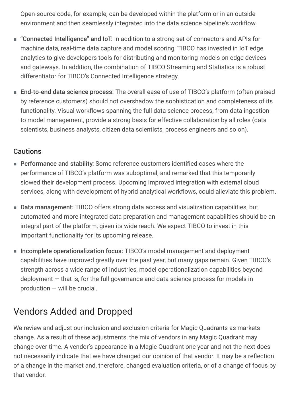 27 . Open-source code, for example, can be developed within the platform or in an outside environment and then seamlessly integrated into the data science pipeline’s workflow. ■ “Connected Intelligence” and IoT: In addition to a strong set of connectors and APIs for machine data, real-time data capture and model scoring, TIBCO has invested in IoT edge analytics to give developers tools for distributing and monitoring models on edge devices and gateways. In addition, the combination of TIBCO Streaming and Statistica is a robust differentiator for TIBCO’s Connected Intelligence strategy. ■ End-to-end data science process: The overall ease of use of TIBCO’s platform (often praised by reference customers) should not overshadow the sophistication and completeness of its functionality. Visual workflows spanning the full data science process, from data ingestion to model management, provide a strong basis for effective collaboration by all roles (data scientists, business analysts, citizen data scientists, process engineers and so on). Cautions ■ Performance and stability: Some reference customers identified cases where the performance of TIBCO’s platform was suboptimal, and remarked that this temporarily slowed their development process. Upcoming improved integration with external cloud services, along with development of hybrid analytical workflows, could alleviate this problem. ■ Data management: TIBCO offers strong data access and visualization capabilities, but automated and more integrated data preparation and management capabilities should be an integral part of the platform, given its wide reach. We expect TIBCO to invest in this important functionality for its upcoming release. ■ Incomplete operationalization focus: TIBCO’s model management and deployment capabilities have improved greatly over the past year, but many gaps remain. Given TIBCO’s strength across a wide range of industries, model operationalization capabilities beyond deployment — that is, for the full governance and data science process for models in production — will be crucial. Vendors Added and Dropped We review and adjust our inclusion and exclusion criteria for Magic Quadrants as markets change. As a result of these adjustments, the mix of vendors in any Magic Quadrant may change over time. A vendor’s appearance in a Magic Quadrant one year and not the next does not necessarily indicate that we have changed our opinion of that vendor. It may be a reflection of a change in the market and, therefore, changed evaluation criteria, or of a change of focus by that vendor.