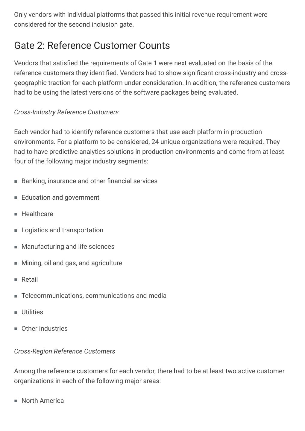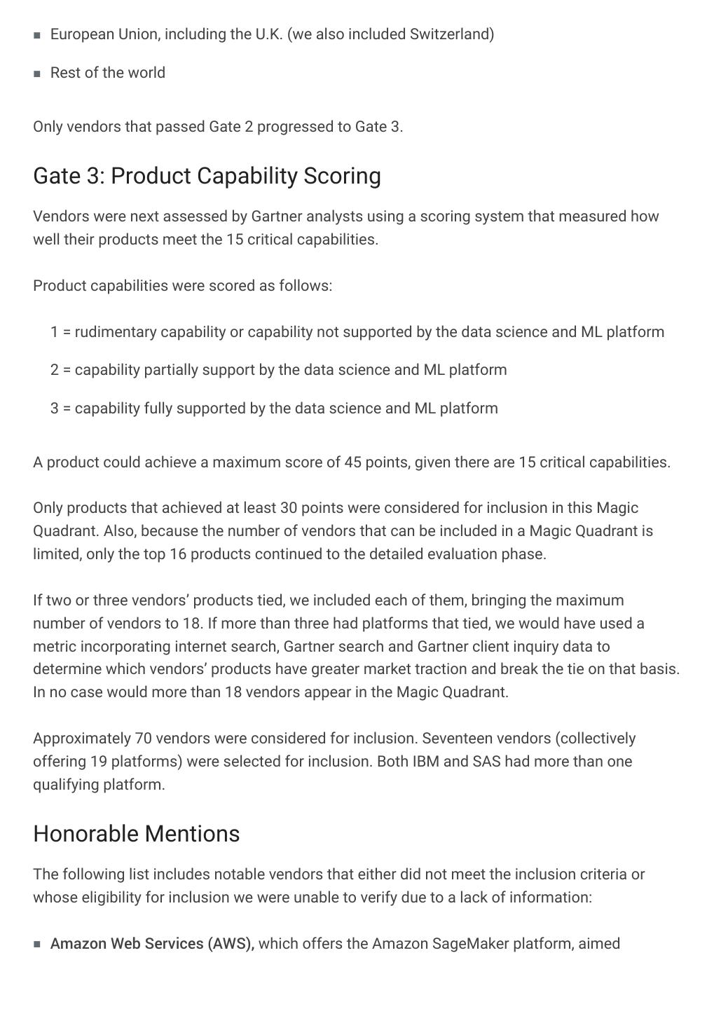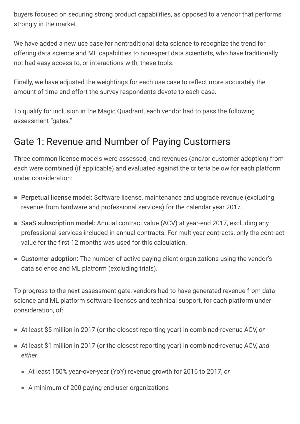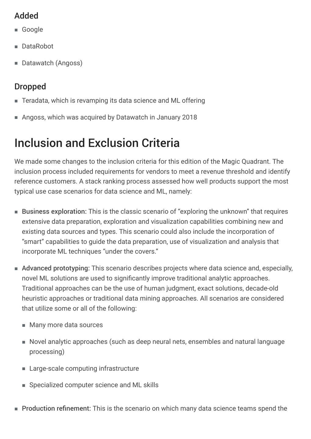 28 .Added ■ Google ■ DataRobot ■ Datawatch (Angoss) Dropped ■ Teradata, which is revamping its data science and ML offering ■ Angoss, which was acquired by Datawatch in January 2018 Inclusion and Exclusion Criteria We made some changes to the inclusion criteria for this edition of the Magic Quadrant. The inclusion process included requirements for vendors to meet a revenue threshold and identify reference customers. A stack ranking process assessed how well products support the most typical use case scenarios for data science and ML, namely: ■ Business exploration: This is the classic scenario of “exploring the unknown” that requires extensive data preparation, exploration and visualization capabilities combining new and existing data sources and types. This scenario could also include the incorporation of “smart” capabilities to guide the data preparation, use of visualization and analysis that incorporate ML techniques “under the covers.” ■ Advanced prototyping: This scenario describes projects where data science and, especially, novel ML solutions are used to significantly improve traditional analytic approaches. Traditional approaches can be the use of human judgment, exact solutions, decade-old heuristic approaches or traditional data mining approaches. All scenarios are considered that utilize some or all of the following: ■ Many more data sources ■ Novel analytic approaches (such as deep neural nets, ensembles and natural language processing) ■ Large-scale computing infrastructure ■ Specialized computer science and ML skills ■ Production refinement: This is the scenario on which many data science teams spend the