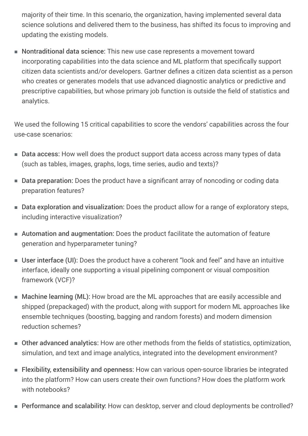 29 . majority of their time. In this scenario, the organization, having implemented several data science solutions and delivered them to the business, has shifted its focus to improving and updating the existing models. ■ Nontraditional data science: This new use case represents a movement toward incorporating capabilities into the data science and ML platform that specifically support citizen data scientists and/or developers. Gartner defines a citizen data scientist as a person who creates or generates models that use advanced diagnostic analytics or predictive and prescriptive capabilities, but whose primary job function is outside the field of statistics and analytics. We used the following 15 critical capabilities to score the vendors’ capabilities across the four use-case scenarios: ■ Data access: How well does the product support data access across many types of data (such as tables, images, graphs, logs, time series, audio and texts)? ■ Data preparation: Does the product have a significant array of noncoding or coding data preparation features? ■ Data exploration and visualization: Does the product allow for a range of exploratory steps, including interactive visualization? ■ Automation and augmentation: Does the product facilitate the automation of feature generation and hyperparameter tuning? ■ User interface (UI): Does the product have a coherent “look and feel” and have an intuitive interface, ideally one supporting a visual pipelining component or visual composition framework (VCF)? ■ Machine learning (ML): How broad are the ML approaches that are easily accessible and shipped (prepackaged) with the product, along with support for modern ML approaches like ensemble techniques (boosting, bagging and random forests) and modern dimension reduction schemes? ■ Other advanced analytics: How are other methods from the fields of statistics, optimization, simulation, and text and image analytics, integrated into the development environment? ■ Flexibility, extensibility and openness: How can various open-source libraries be integrated into the platform? How can users create their own functions? How does the platform work with notebooks? ■ Performance and scalability: How can desktop, server and cloud deployments be controlled?