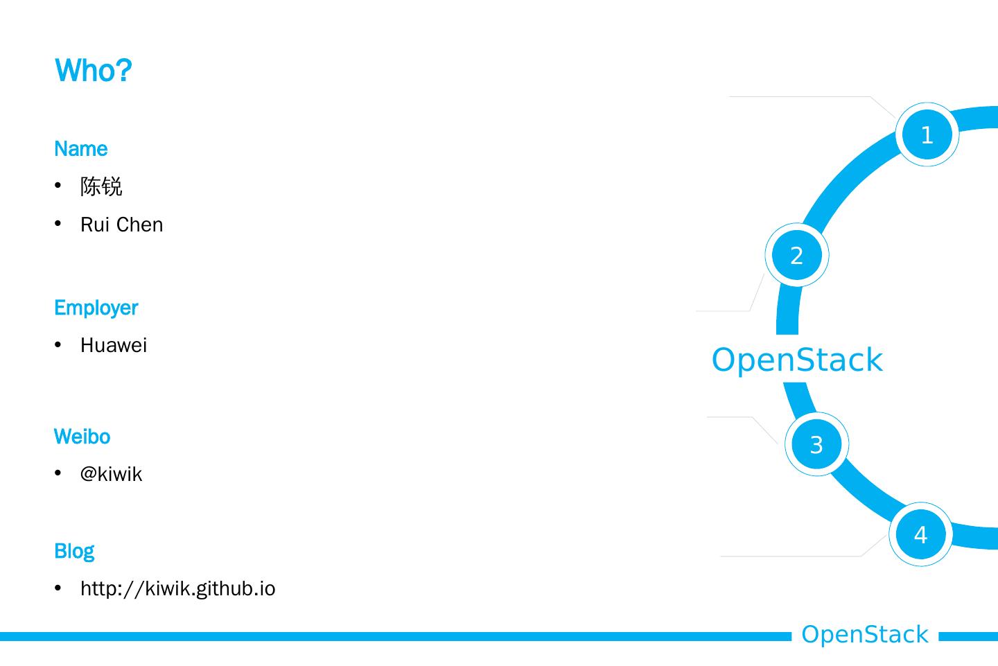 2 .1 2 3 4 Name 陈锐 Rui Chen OpenStack Employer Huawei Weibo @ kiwik Blog http://kiwik.github.io Who?