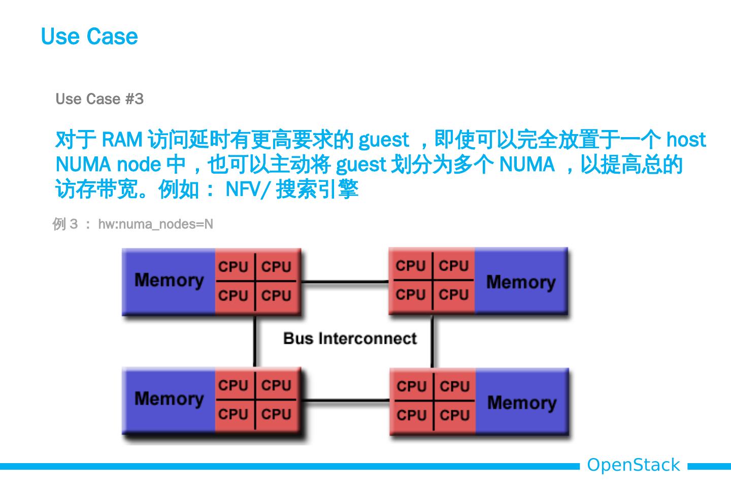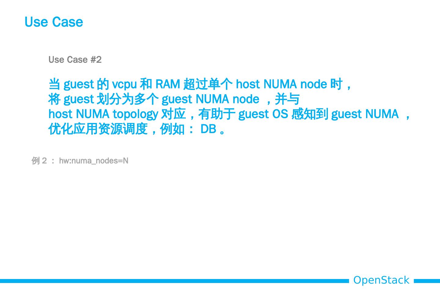 12 .Use Case Use Case #1 使 guest 的 vcpu 和 RAM 从一个 host NUMA node 中获取, 避免跨 NUMA node 的 RAM 接入,提高 guest 性能, 减少不可预知的延时。 例 1 : hw:numa_nodes =1