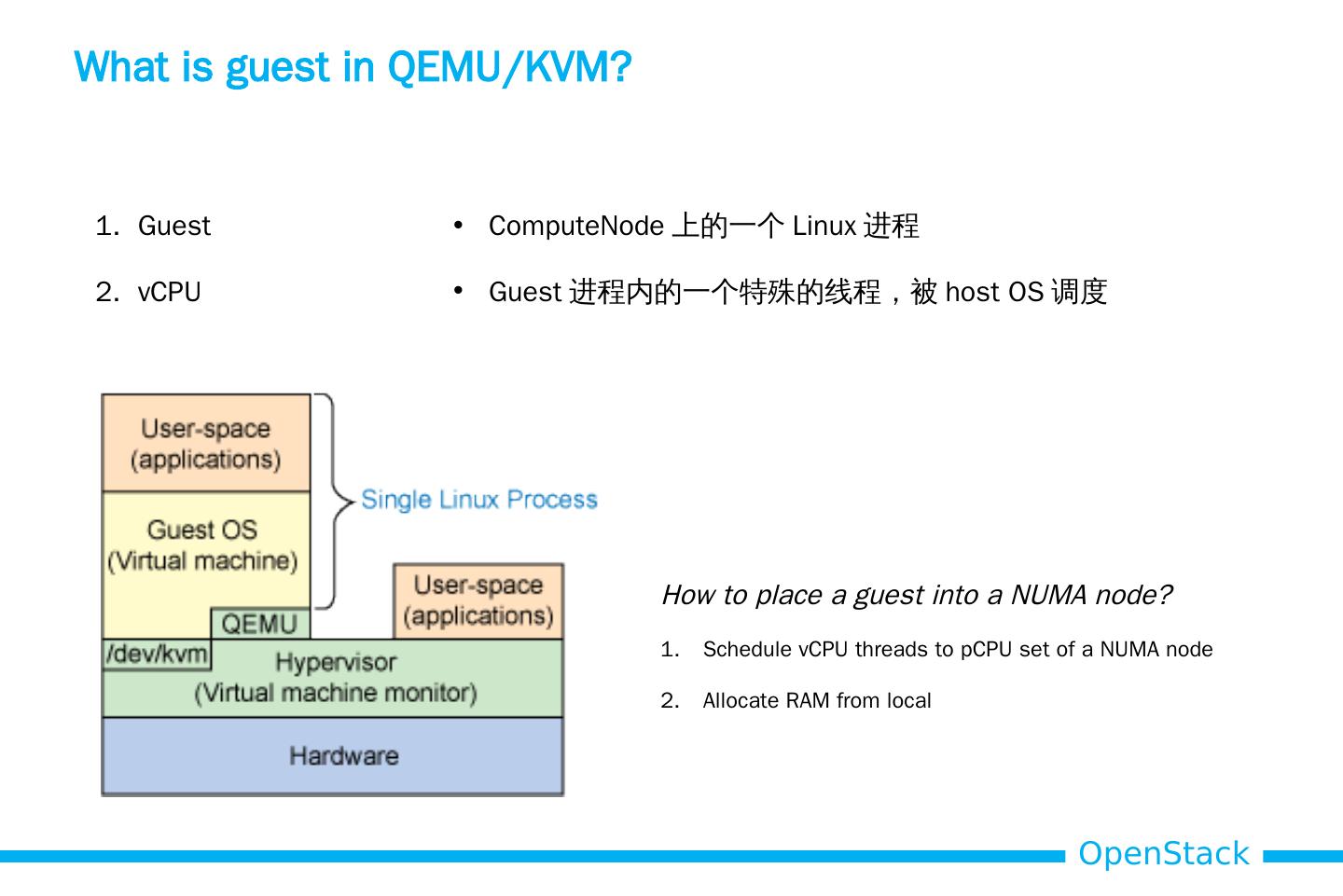 15 .What is guest in QEMU/KVM? Guest vCPU ComputeNode 上的一个 Linux 进程 Guest 进程内的一个特殊的线程,被 host OS 调度 How to place a guest into a NUMA node? Schedule vCPU threads to pCPU set of a NUMA node Allocate RAM from local