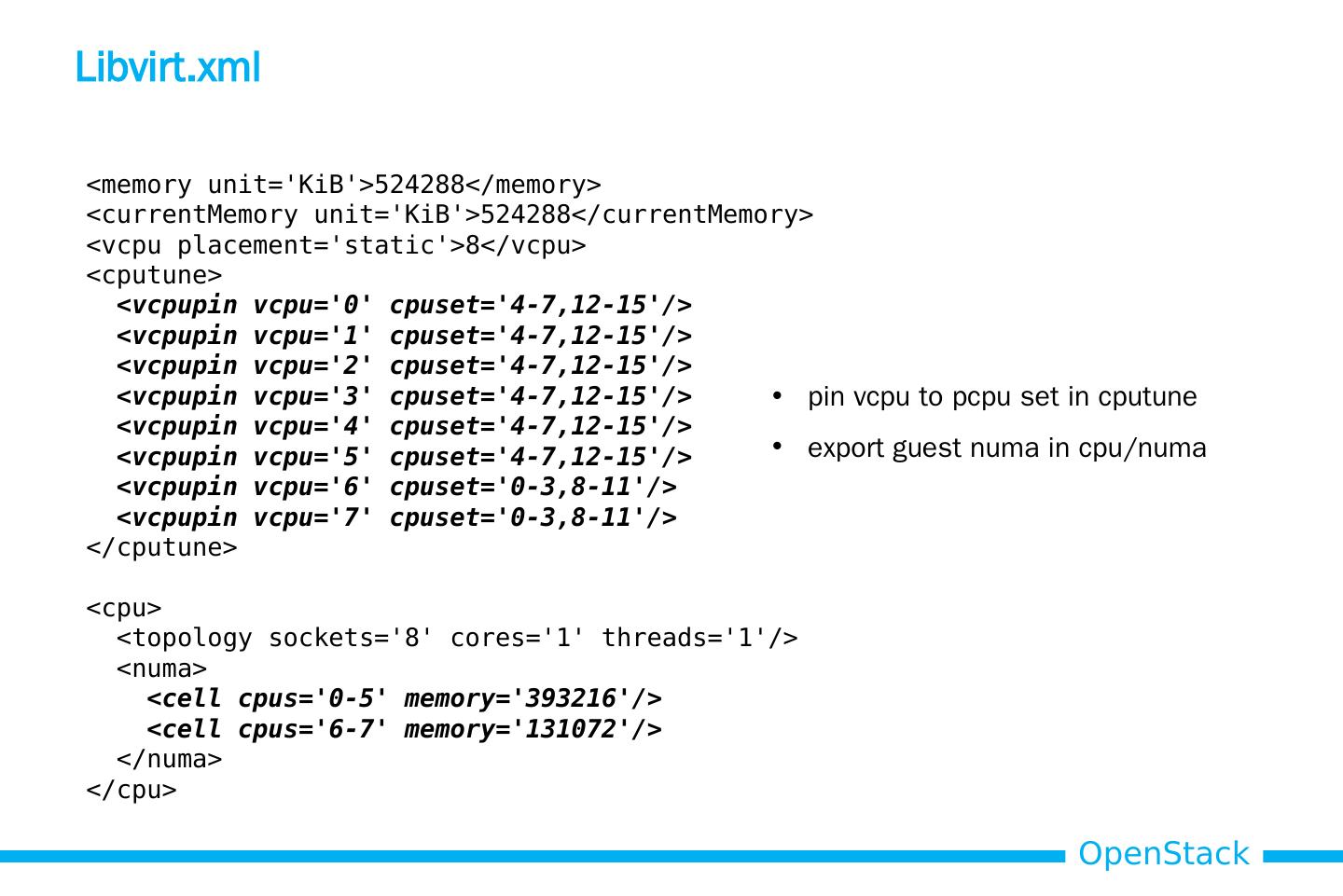 19 .Libvirt.xml pin vcpu to pcpu set in cputune export guest numa in cpu / numa <memory unit= KiB >524288</memory> < currentMemory unit= KiB >524288</ currentMemory > < vcpu placement=static>8</ vcpu > < cputune > < vcpupin vcpu =0 cpuset =4-7,12-15/> < vcpupin vcpu =1 cpuset =4-7,12-15/> < vcpupin vcpu =2 cpuset =4-7,12-15/> < vcpupin vcpu =3 cpuset =4-7,12-15/> < vcpupin vcpu =4 cpuset =4-7,12-15/> < vcpupin vcpu =5 cpuset =4-7,12-15/> < vcpupin vcpu =6 cpuset =0-3,8-11/> < vcpupin vcpu =7 cpuset =0-3,8-11/> </ cputune > < cpu > <topology sockets=8 cores=1 threads=1/> < numa > <cell cpus =0-5 memory=393216/> <cell cpus =6-7 memory=131072/> </ numa > </ cpu >