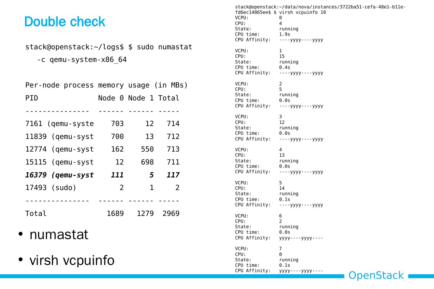 20 .Double check stack@openstack :~/logs$ $ sudo numastat -c qemu-system-x86_64 Per-node process memory usage (in MBs) PID Node 0 Node 1 Total --------------- ------ ------ ----- 7161 ( qemu-syste 703 12 714 11839 ( qemu-syst 700 13 712 12774 ( qemu-syst 162 550 713 15115 ( qemu-syst 12 698 711 16379 ( qemu-syst 111 5 117 17493 ( sudo ) 2 1 2 --------------- ------ ------ ----- Total 1689 1279 2969 stack@openstack :~/data/nova/instances/3722ba51-cefa-48e1-b11e-fd6ec14865ee$ $ virsh vcpuinfo 10 VCPU: 0 CPU: 4 State: running CPU time: 1.9s CPU Affinity: ---- yyyy ---- yyyy VCPU: 1 CPU: 15 State: running CPU time: 0.4s CPU Affinity: ---- yyyy ---- yyyy VCPU: 2 CPU: 5 State: running CPU time: 0.0s CPU Affinity: ---- yyyy ---- yyyy VCPU: 3 CPU: 12 State: running CPU time: 0.0s CPU Affinity: ---- yyyy ---- yyyy VCPU: 4 CPU: 13 State: running CPU time: 0.0s CPU Affinity: ---- yyyy ---- yyyy VCPU: 5 CPU: 14 State: running CPU time: 0.1s CPU Affinity: ---- yyyy ---- yyyy VCPU: 6 CPU: 2 State: running CPU time: 0.0s CPU Affinity: yyyy ---- yyyy ---- VCPU: 7 CPU: 0 State: running CPU time: 0.1s CPU Affinity: yyyy ---- yyyy ---- numastat virsh vcpuinfo
