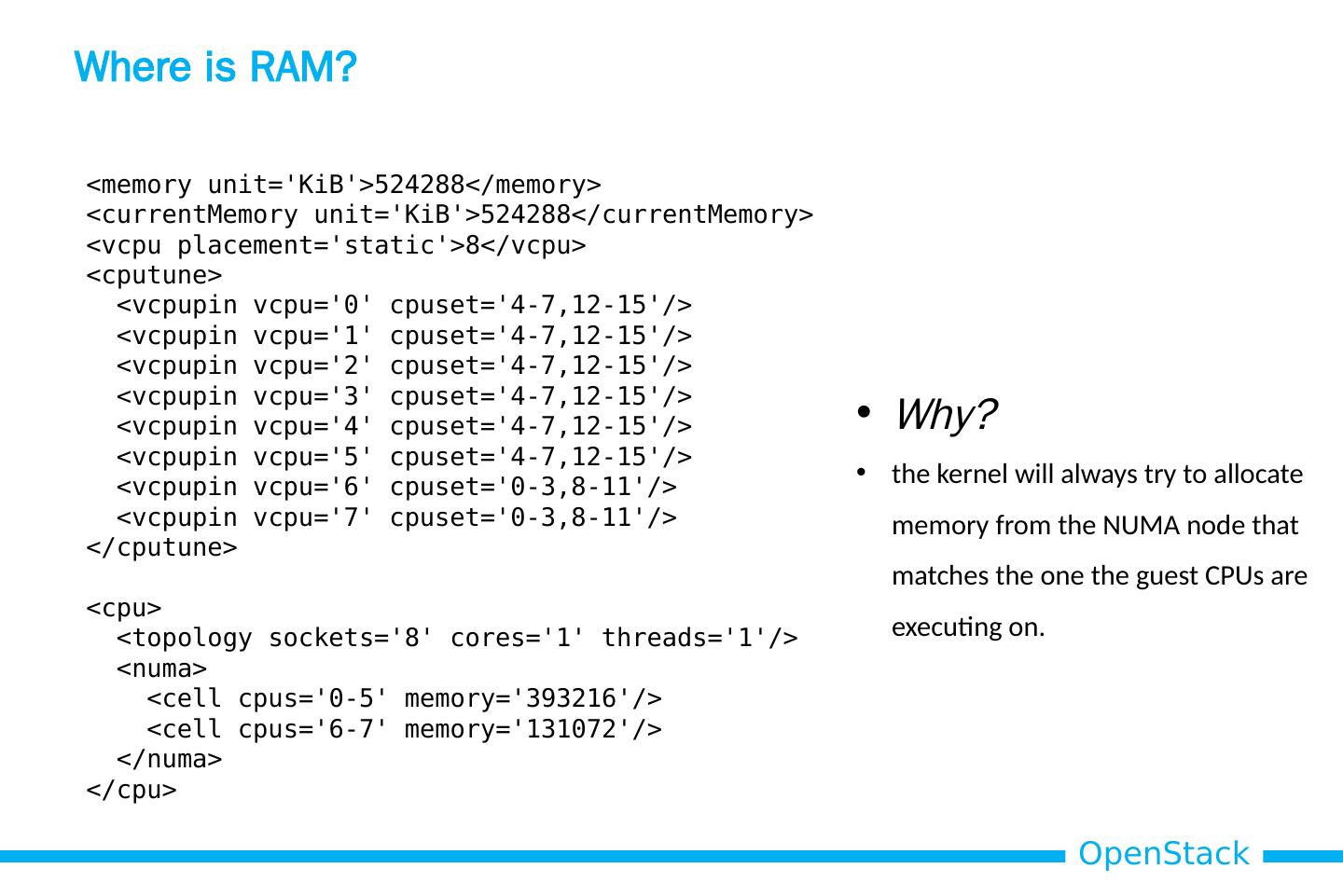 21 .Where is RAM? Why? the kernel will always try to allocate memory from the NUMA node that matches the one the guest CPUs are executing on. <memory unit= KiB >524288</memory> < currentMemory unit= KiB >524288</ currentMemory > < vcpu placement=static>8</ vcpu > < cputune > < vcpupin vcpu =0 cpuset =4-7,12-15/> < vcpupin vcpu =1 cpuset =4-7,12-15/> < vcpupin vcpu =2 cpuset =4-7,12-15/> < vcpupin vcpu =3 cpuset =4-7,12-15/> < vcpupin vcpu =4 cpuset =4-7,12-15/> < vcpupin vcpu =5 cpuset =4-7,12-15/> < vcpupin vcpu =6 cpuset =0-3,8-11/> < vcpupin vcpu =7 cpuset =0-3,8-11/> </ cputune > < cpu > <topology sockets=8 cores=1 threads=1/> < numa > <cell cpus =0-5 memory=393216/> <cell cpus =6-7 memory=131072/> </ numa > </ cpu >