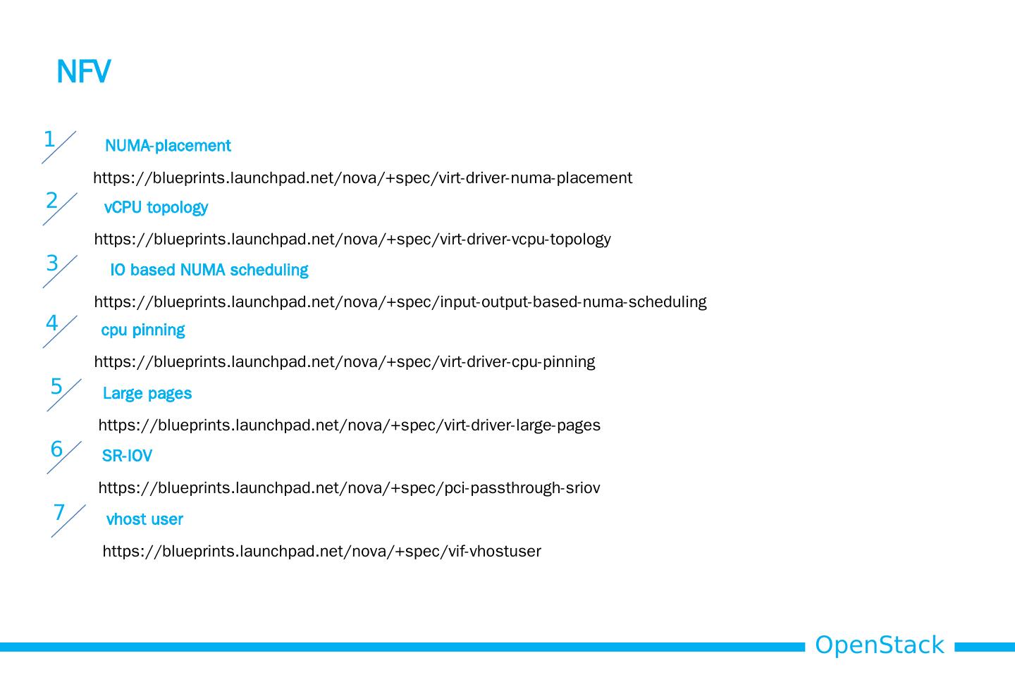 23 .NFV 1 NUMA-placement https://blueprints.launchpad.net/nova/+spec/virt-driver-numa-placement 2 vCPU topology https://blueprints.launchpad.net/nova/+spec/virt-driver-vcpu-topology 3 IO based NUMA scheduling https://blueprints.launchpad.net/nova/+spec/input-output-based-numa-scheduling 4 cpu pinning https://blueprints.launchpad.net/nova/+spec/virt-driver-cpu-pinning 5 Large pages https://blueprints.launchpad.net/nova/+spec/virt-driver-large-pages 6 SR-IOV https://blueprints.launchpad.net/nova/+spec/pci-passthrough-sriov 7 vhost user https://blueprints.launchpad.net/nova/+spec/vif-vhostuser