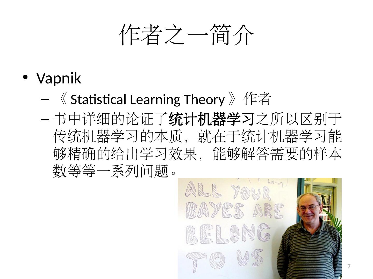 7 .作者之一简介 Vapnik 《Statistical Learning Theory 》 作者 书中详细的论证了 统计机器学习 之所以区别于传统机器学习的本质,就在于统计机器学习能够精确的给出学习效果,能够解答需要的样本数等等一系列问题。 7