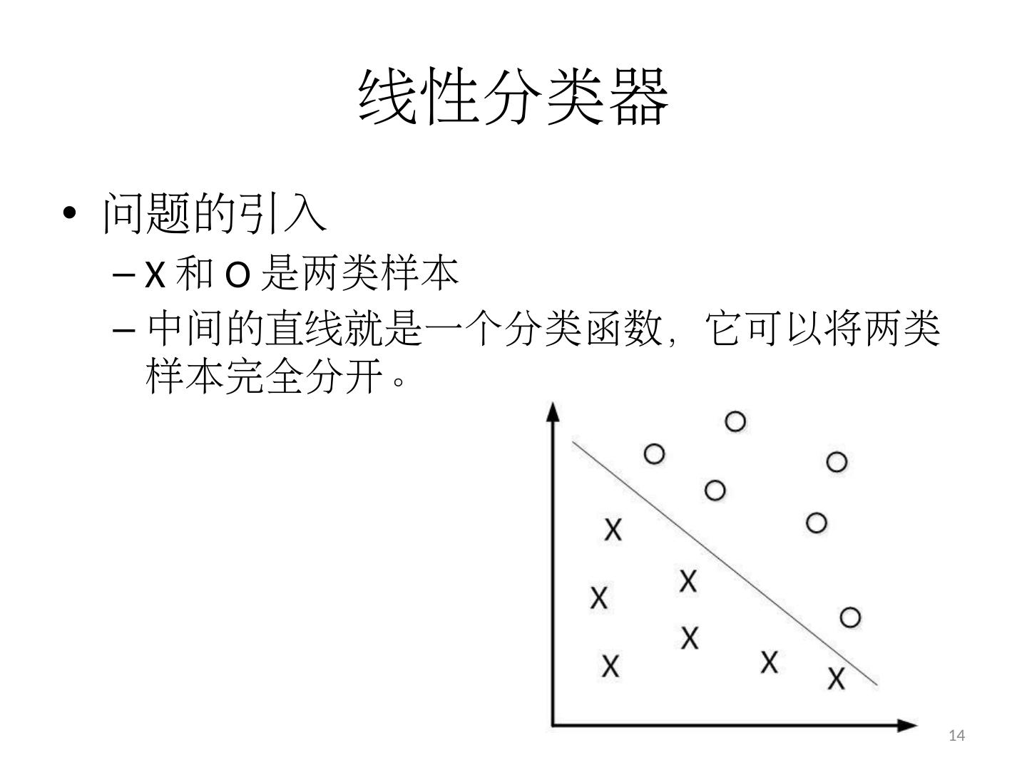 14 .线性分类器 问题的引入 X 和 O 是两类样本 中间的直线就是一个分类函数,它可以将两类样本完全分开。 14