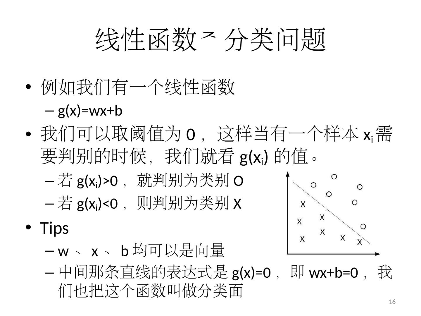 16 .线性 函数 分类问题 例如我们有一个线性 函数 g(x)= wx+b 我们可以取阈值为 0 ,这样当有一个样本 x i 需要判别的时候,我们就看 g(x i ) 的值 。 若 g(x i )>0 ,就判别为 类别 O 若 g(x i )<0 ,则判别为 类别 X Tips w 、 x 、 b 均可以是向量 中间那条直线的表达式是 g(x)=0 ,即 wx+b =0 ,我们也把这个函数叫做分类 面 16
