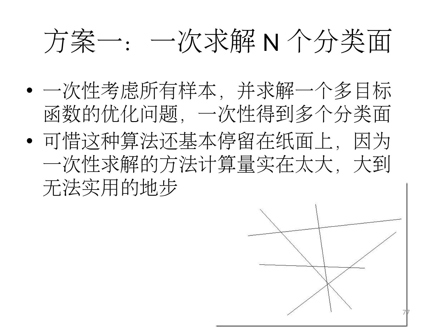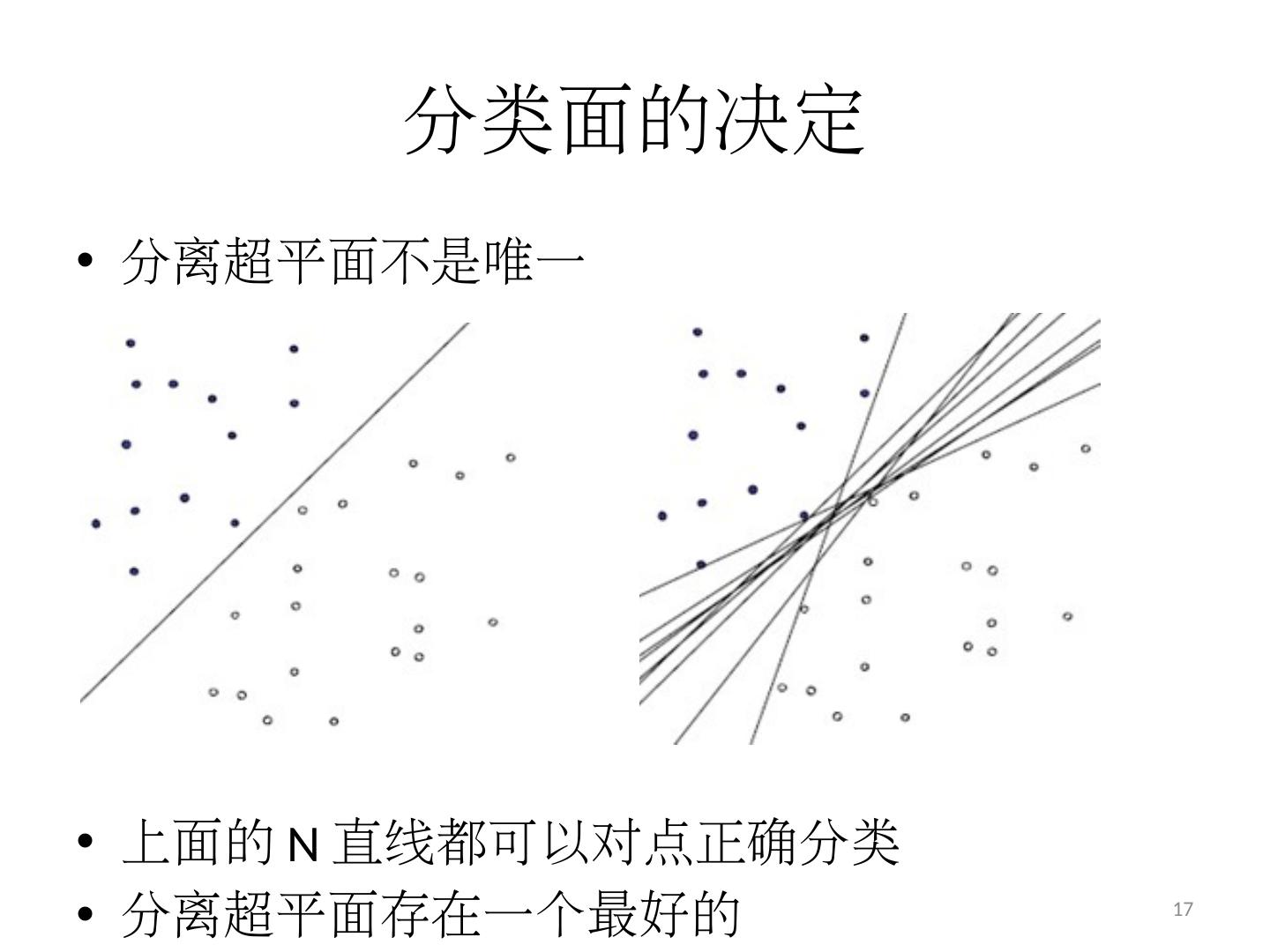 17 .分类面的决定 分离超平面不是 唯一 上面 的 N 直线 都可以对点正确 分类 分离超平面存在一个最好 的 17