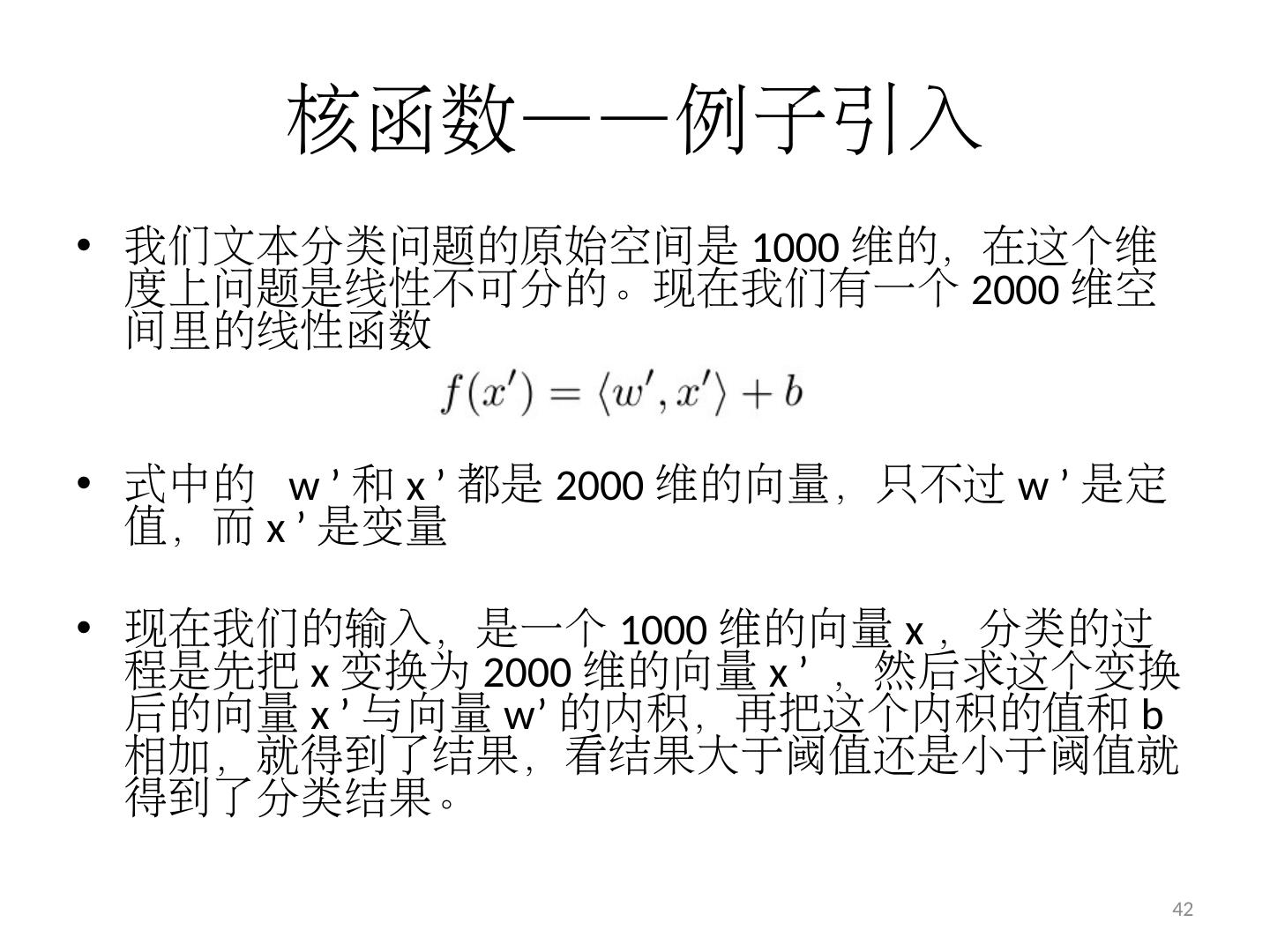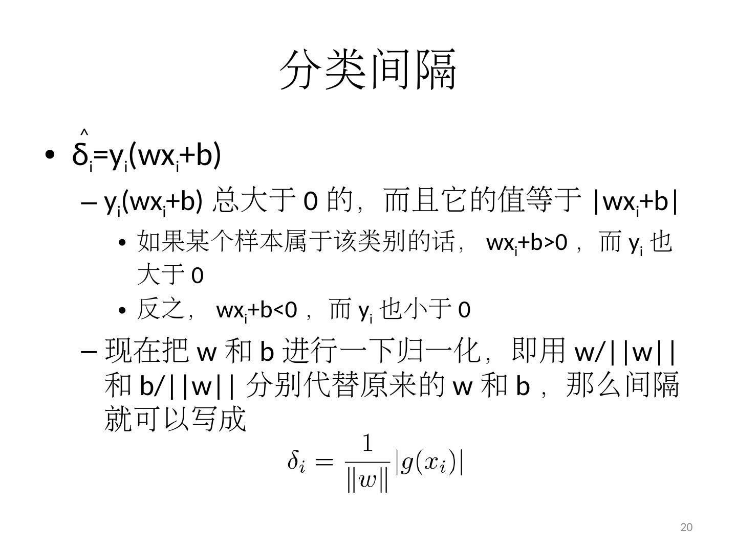 19 .“分类间隔”的引入 文本分类分类时样本格式 label ( 标示出这个样本属于哪个类别 ) feature (文本 特征所组成的向量 ) 假设 label=±1 ,我们就可以 定义 一个样本点到某个超平面的 间隔为 ( 这是定义 ) δ i = y i ( wx i +b ) 19 ^