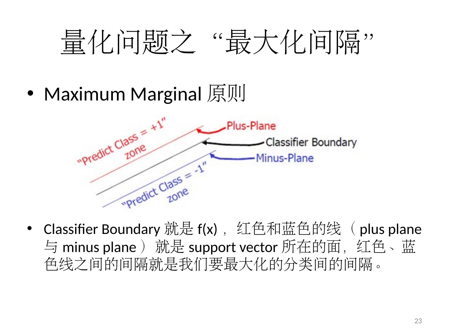 23 .量化问题之“最大化间隔” Maximum Marginal 原则 Classifier Boundary 就是 f(x) ,红色和蓝色的线( plus plane 与 minus plane )就是 support vector 所在的面,红色、蓝色线之间 的 间隔 就是 我们要最大化的分类间 的间隔。 23