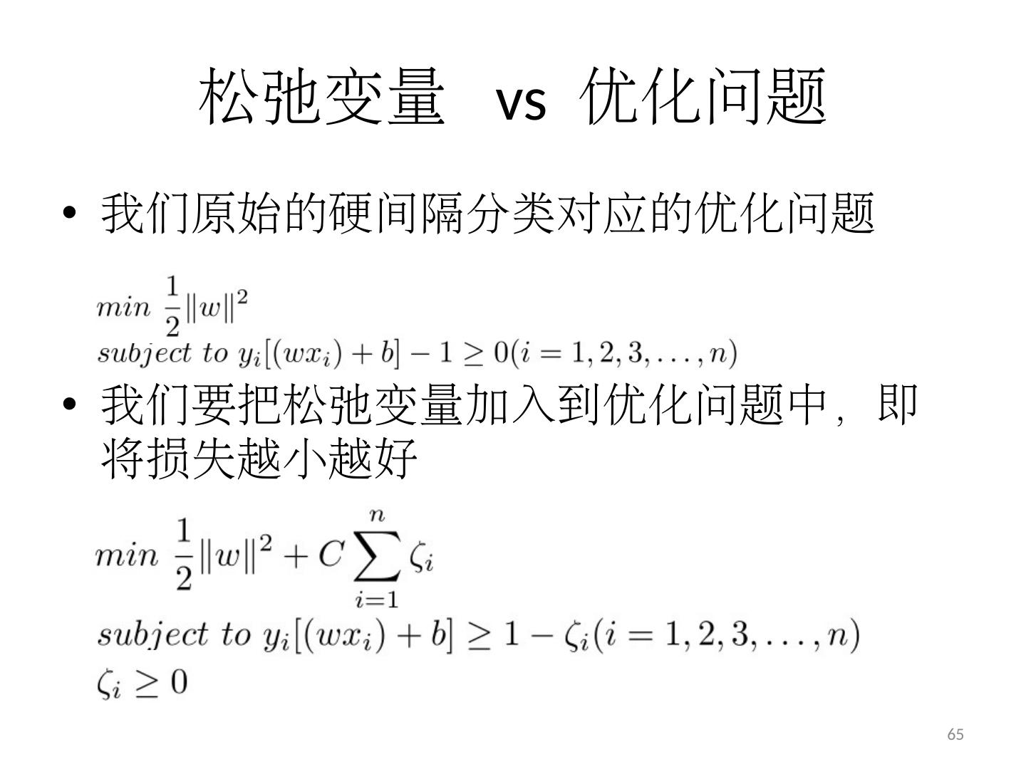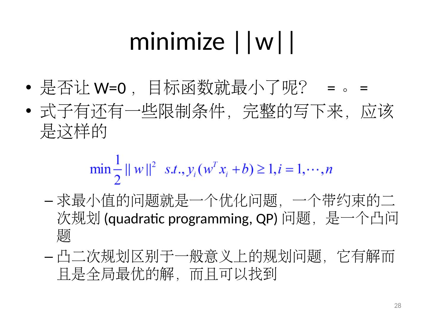 28 .minimize ||w|| 是否让 W=0 ,目标函数就最小了呢? = 。 = 式子有还有一些限制条件,完整的写下来,应该是这样 的 求最小值的问题就是一个优化 问题,一 个带约束的二次规划 (quadratic programming, QP) 问题,是一个凸 问题 凸二次规划区别于一般意义上的规划问题, 它有 解而且是 全局最优的解 ,而且 可以找到 28
