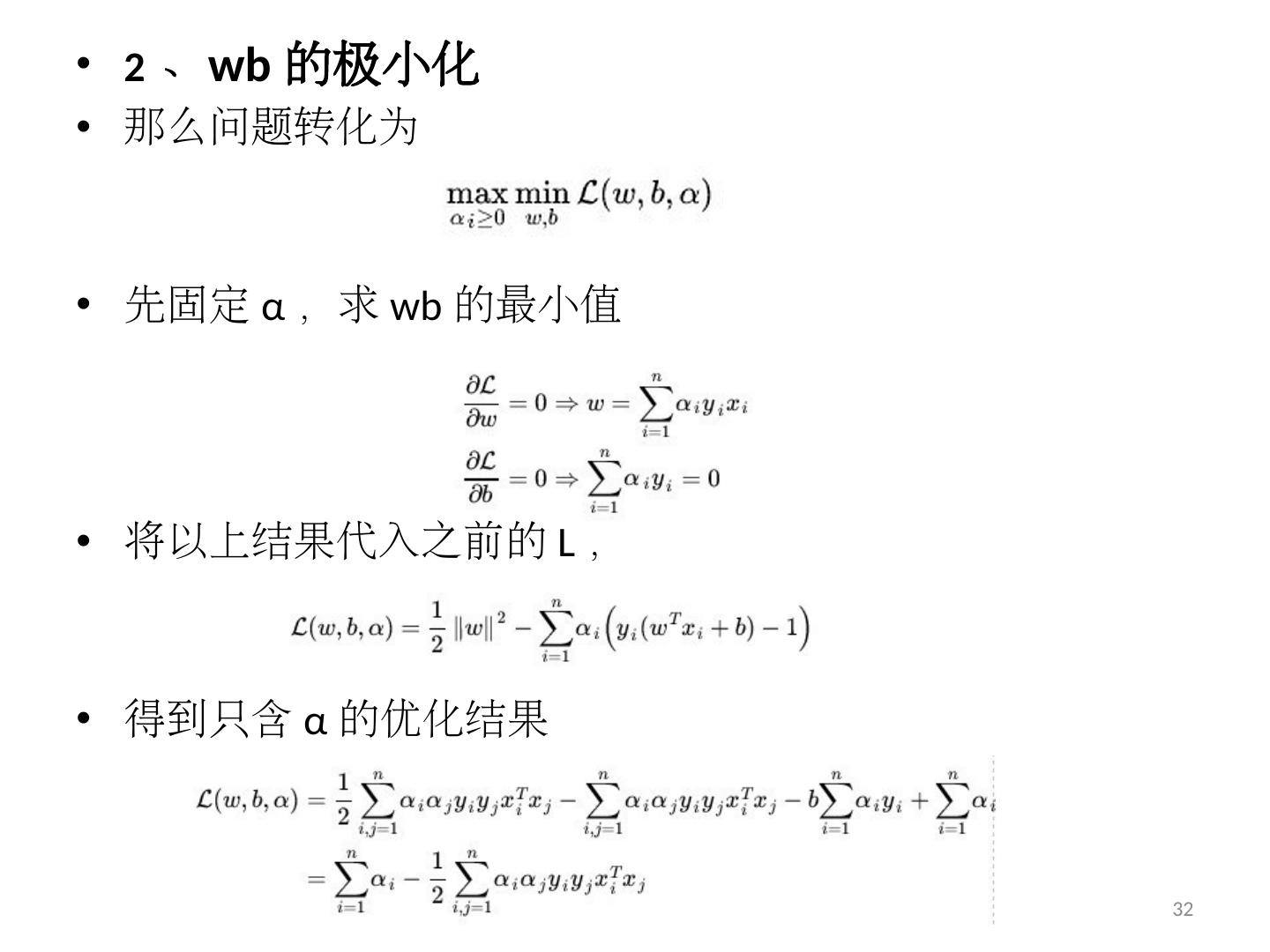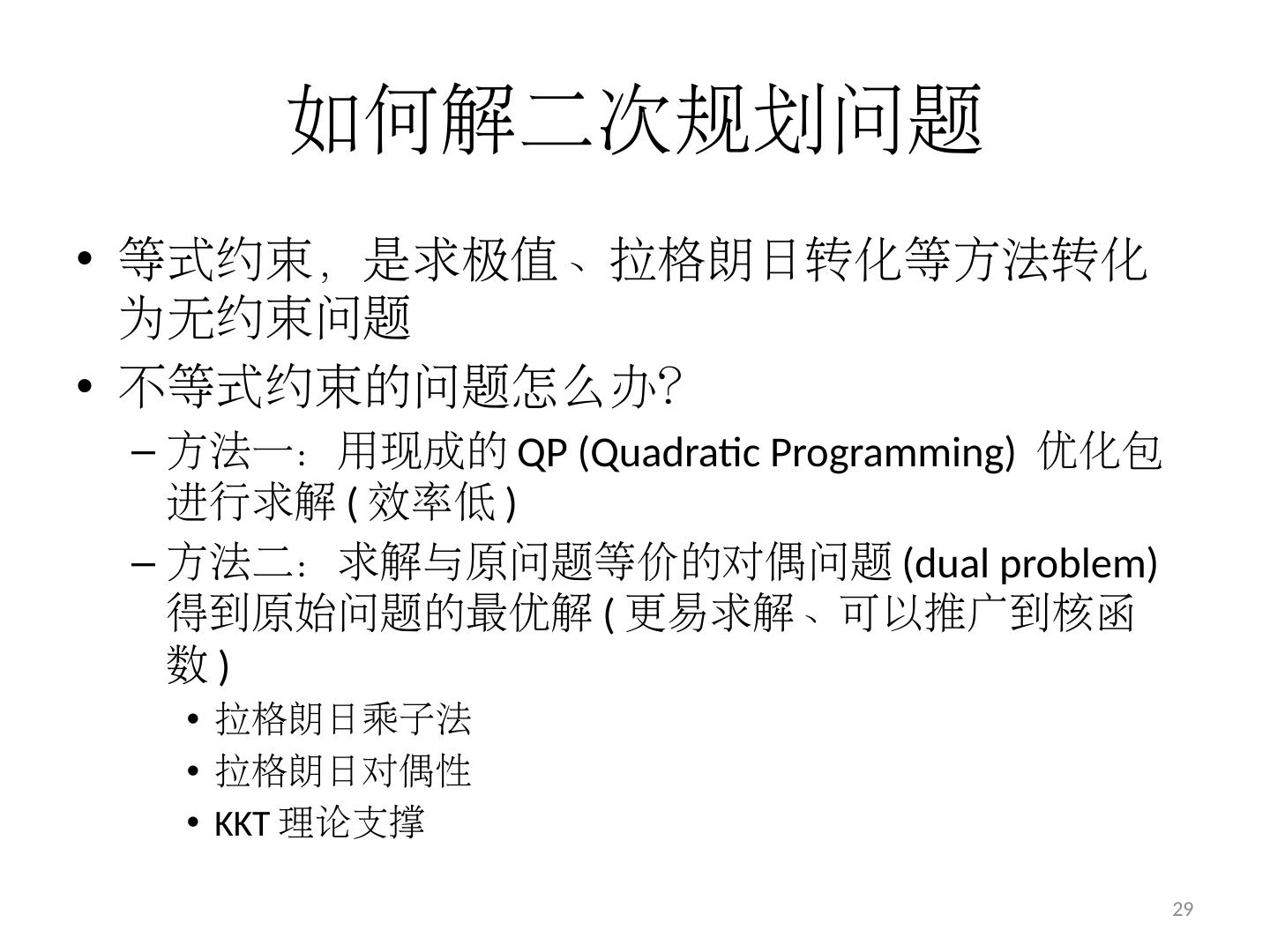29 .如何解二次规划问题 等式约束,是求极值、拉格朗日转化等方法转化为无约束问题 不等式约束 的 问题怎么办? 方法 一 :用 现成的 QP (Quadratic Programming) 优化包进行 求解 ( 效率低 ) 方法 二:求解与原问题等价的对偶 问题 (dual problem) 得到 原始问题的 最优解 ( 更易求解、可以推广到核函数 ) 拉格朗日乘子法 拉格朗日对偶性 KKT 理论支撑 29