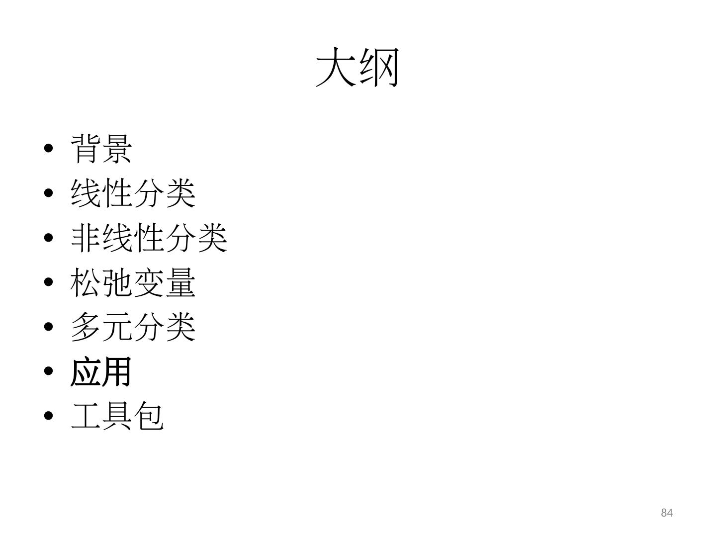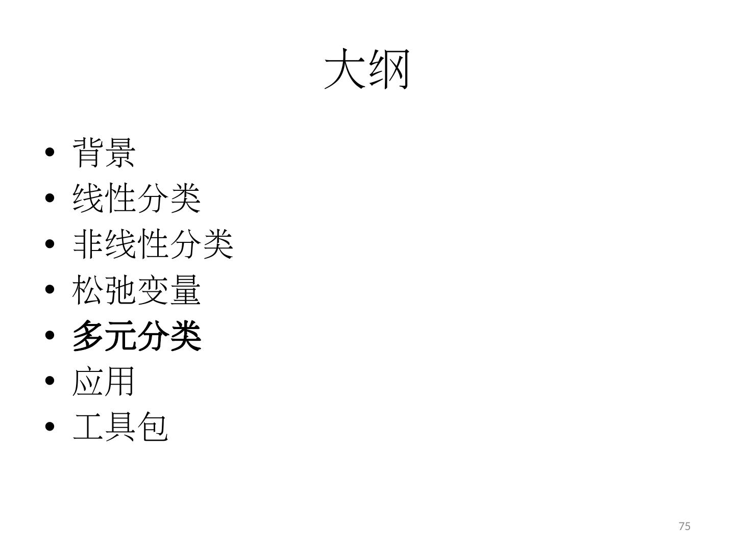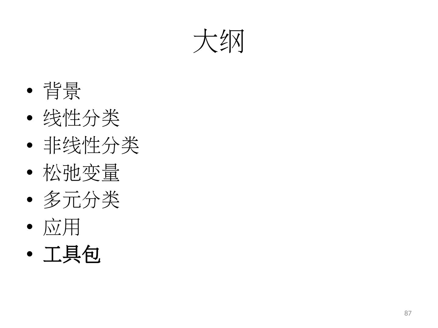13 .大纲 背景 线性分类 非线性分类 松弛变量 多元 分类 应用 工具包 13