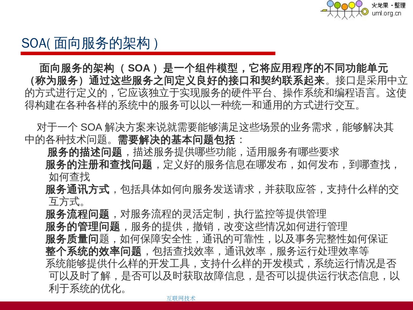 2 .SOA( 面向服务的架构 ) 面向 服务的架构( SOA )是一个组件模型,它将应用程序的不同功能单元(称为服务)通过这些服务之间定义良好的接口和契约联系起来 。接口是采用中立的方式进行定义的,它应该独立于实现服务的硬件平台、操作系统和编程语言。这使得构建在各种各样的系统中的服务可以以一种统一和通用的方式进行交互。 对于一个 SOA 解决方案来说就需要能够满足这些场景的业务需求,能够解决其中的各种技术问题 。 需要解决的基本问题包括 : 服务的描述问题 ,描述 服务提供哪些功能,适用服务有哪些要求 服务 的注册和查找问题 ,定义好的服务信息在哪发布,如何发布,到哪查找,如何查找 服务 通讯方式 ,包括具体如何向服务发送请求,并获取应答,支持什么样的交互方式。 服务 流程问题 ,对服务流程的灵活定制,执行监控等提供管理 服务 的管理问题 ,服务的提供,撤销,改变这些情况如何进行管理 服务 质量问 题,如何保障安全性,通讯的可靠性,以及事务完整性如何保证 整个 系统的效率问题 ,包括查找效率,通讯效率,服务运行处理效率等 系统 能够提供什么样的开发工具,支持什么样的开发 模式,系统 运行情况是否可以及时了解,是否可以及时获取故障信息,是否可以提供运行状态信息,以利于系统的优化。