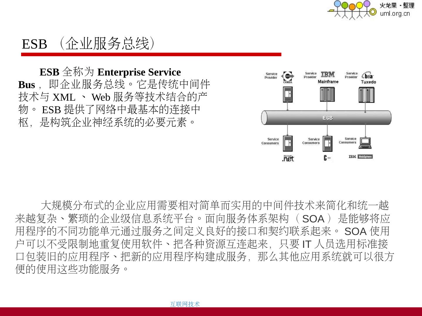 3 .ESB( 企业服务总线 ) ESB 全称为Enterprise Service Bus,即企业服务总线。 它是传统中间件技术与XML、Web服务等技术结合的产物。ESB提供了网络中最基本的连接中枢,是构筑企业神经系统的必要元素。 大规模 分布式的企业应用需要相对简单而实用的中间件技术来简化和统一越来越复杂、繁琐的企业级信息系统平台。面向服务体系架构( SOA )是能够将应用程序的不同功能单元通过服务之间定义良好的接口和契约联系起来。 SOA 使用户可以不受限制地重复使用软件、把各种资源互连起来,只要 IT 人员选用标准接口包装旧的应用程序、把新的应用程序构建成服务,那么其他应用系统就可以很方便的使用这些功能服务。