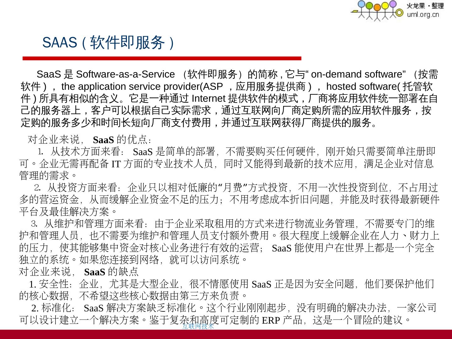 5 .SAAS ( 软件即服务 ) SaaS 是Software-as-a-Service(软件即服务)的 简称 , 它 与“ on-demand software” (按需软件 ) , the application service provider(ASP ,应用服务提供商 ) , hosted software( 托管软件 ) 所具有相似的含义。它是一种通过 Internet 提供软件的模式,厂商将应用软件统一部署在自己的服务器上,客户可以根据自己实际需求,通过互联网向厂商定购所需的应用软件服务,按定购的服务多少和时间长短向厂商支付费用,并通过互联网获得厂商提供的服务。 对 企业来说,SaaS的 优点: ⒈ 从技术方面来看:SaaS是简单的部署,不需要购买任何硬件,刚开始只需要简单注册即可。企业无需再配备IT方面的专业技术人员,同时又能得到最新的技术应用,满足企业对信息管理的需求。 ⒉ 从投资方面来看:企业只以相对低廉的“月费”方式投资,不用一次性投资到位,不占用过多的营运资金,从而缓解企业资金不足的压力;不用考虑成本折旧问题,并能及时获得最新硬件平台及最佳解决方案。 ⒊ 从维护和管理方面来看:由于企业采取租用的方式来进行物流业务管理,不需要专门的维护和管理人员,也不需要为维护和管理人员支付额外费用。很大程度上缓解企业在人力、财力上的压力,使其能够集中资金对核心业务进行有效的运营;SaaS能使用户在世界上都是一个完全独立的系统。如果您连接到网络,就可以访问系统。 对企业来说,SaaS的 缺点 1 .安全性:企业,尤其是大型企业,很不情愿使用SaaS正是因为安全问题,他们要保护他们的核心数据,不希望这些核心数据由第三方来负责。 2 .标准化:SaaS解决方案缺乏标准化。这个行业刚刚起步,没有明确的解决办法,一家公司可以设计建立一个解决方案。鉴于复杂和高度可定制的ERP产品,这是一个冒险的建议。
