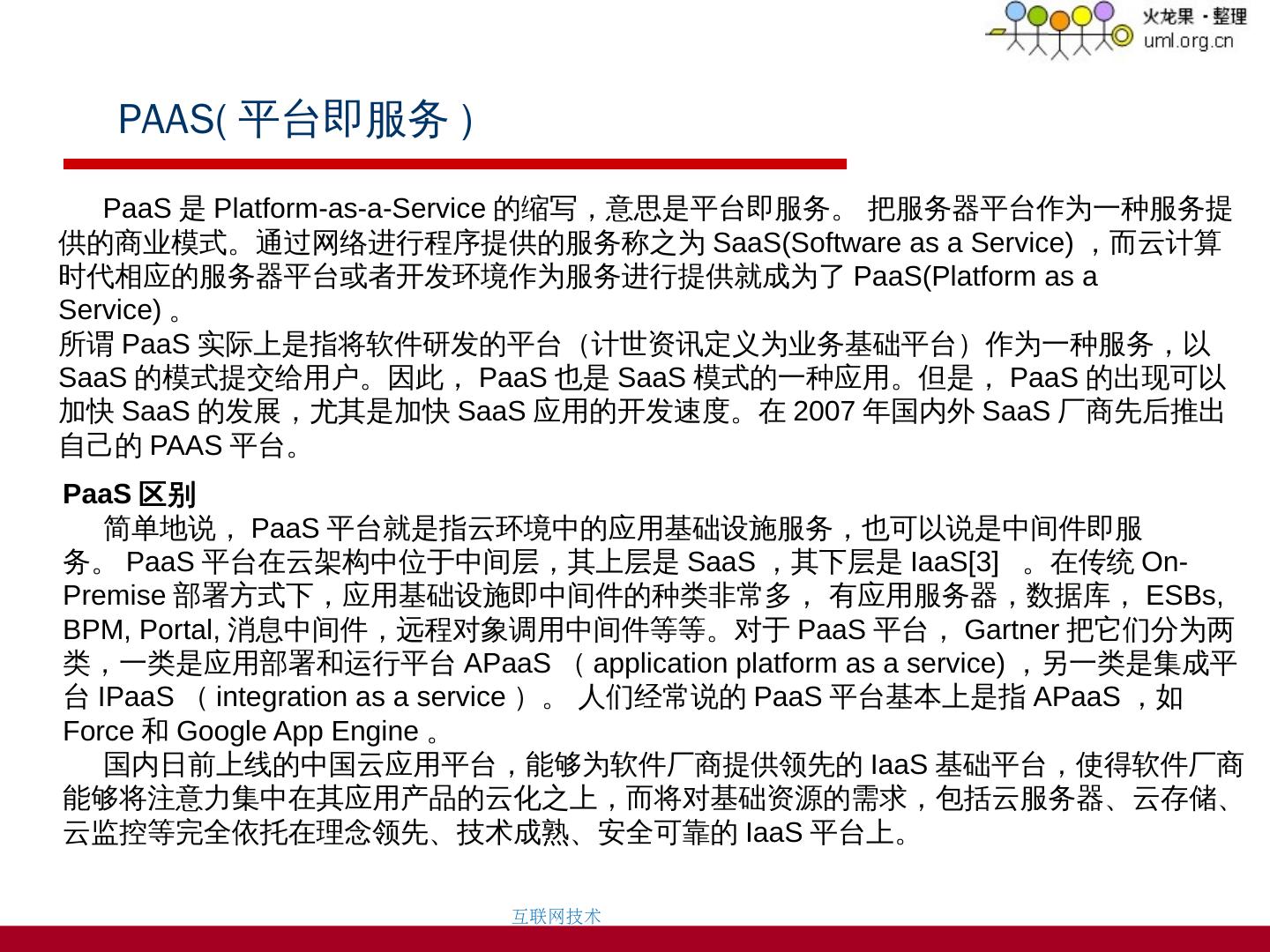 6 .PAAS( 平台即服务 ) PaaS 是 Platform-as-a-Service 的缩写,意思是平台即服务。 把服务器平台作为一种服务提供的商业模式。通过网络进行程序提供的服务称之为 SaaS(Software as a Service) ,而云计算时代相应的服务器平台或者开发环境作为服务进行提供就成为了 PaaS (Platform as a Service) 。 所谓 PaaS 实际上是指将软件研发的平台(计世资讯定义为业务基础平台)作为一种服务,以 SaaS 的模式提交给用户。因此, PaaS 也是 SaaS 模式的一种应用。但是, PaaS 的出现可以加快 SaaS 的发展,尤其是加快 SaaS 应用的开发速度。在 2007 年国内外 SaaS 厂商先后推出自己的 PAAS 平台。 PaaS区别 简单 地说,PaaS平台就是指云环境中的应用基础设施服务,也可以说是中间件即服务。PaaS平台在云架构中位于中间层,其上层是SaaS,其下层是IaaS[3] 。在传统On-Premise部署方式下,应用基础设施即中间件的种类非常多, 有应用服务器,数据库,ESBs, BPM, Portal,消息中间件,远程对象调用中间件等等。对于PaaS平台,Gartner把它们分为两类,一类是应用部署和运行平台APaaS(application platform as a service),另一类是集成平台IPaaS(integration as a service)。 人们经常说的PaaS平台基本上是指APaaS,如Force和Google App Engine。 国内 日前上线的中国云应用平台,能够为软件厂商提供领先的IaaS基础平台,使得软件厂商能够将注意力集中在其应用产品的云化之上,而将对基础资源的需求,包括云服务器、云存储、云监控等完全依托在理念领先、技术成熟、安全可靠的IaaS平台上。