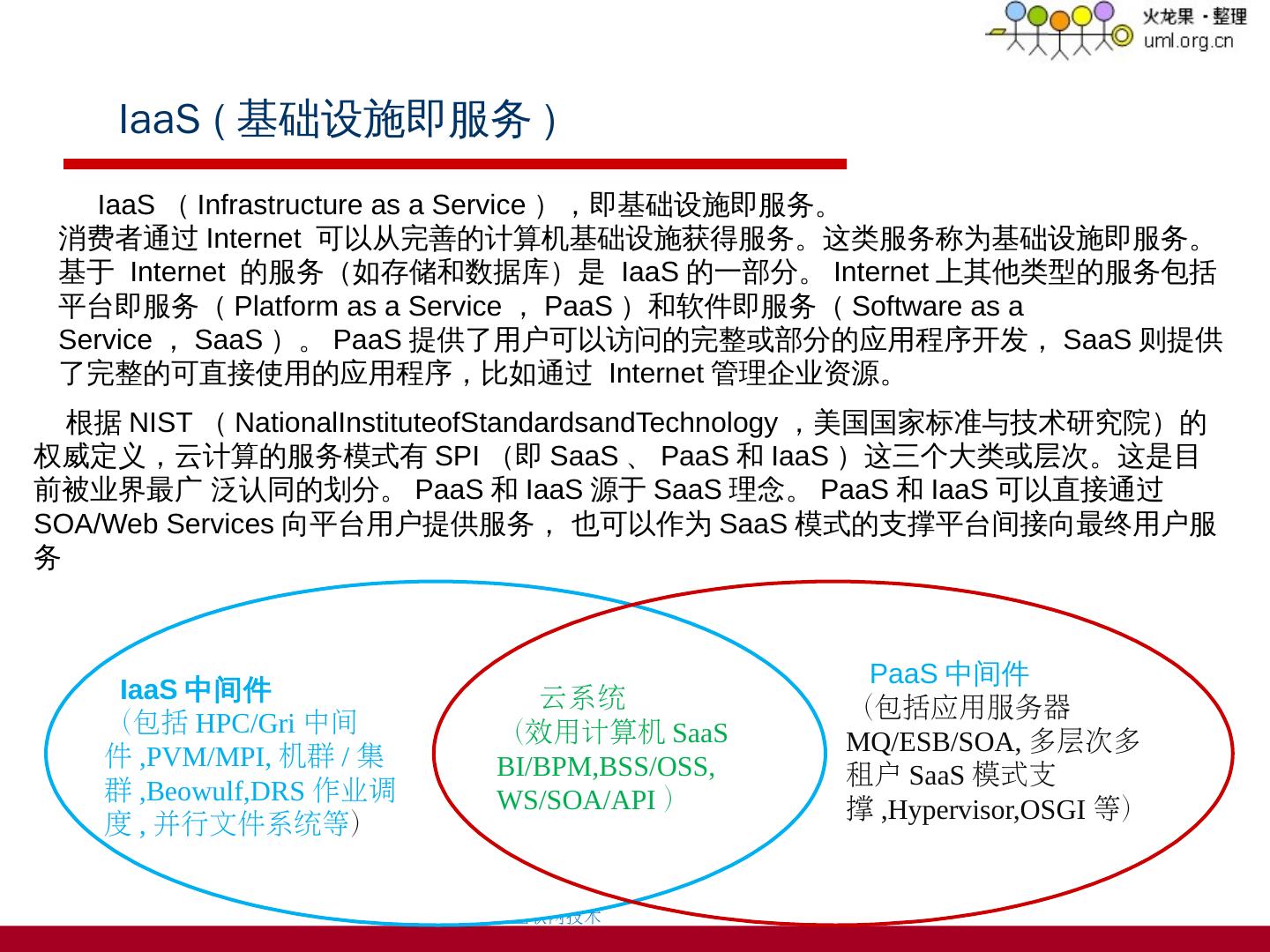 7 .IaaS ( 基础设施即服务 ) IaaS ( Infrastructure as a Service ),即基础设施即服务。 消费者通过 Internet 可以从完善的计算机基础设施获得服务。这类服务称为基础设施即服务。基于 Internet 的服务(如存储和数据库)是 IaaS 的一部分。 Internet 上其他类型的服务包括平台即服务( Platform as a Service , PaaS )和软件即服务( Software as a Service , SaaS )。 PaaS 提供了用户可以访问的完整或部分的应用程序开发, SaaS 则提供了完整的可直接使用的应用程序,比如通过 Internet 管理企业资源。 根据 NIST ( NationalInstituteofStandardsandTechnology ,美国国家标准与技术研究院)的权威定义,云计算的服务模式有 SPI (即 SaaS 、 PaaS 和 IaaS )这三个大类或层次。这是目前被业界最广 泛认同的划分。 PaaS 和 IaaS 源于 SaaS 理念。 PaaS 和 IaaS 可以直接通过 SOA/Web Services 向平台用户提供服务, 也可以作为 SaaS 模式的支撑平台间接向最终用户 服务 IaaS 中间件 (包括 HPC/ Gri 中间件 ,PVM/MPI, 机群 / 集群 , Beowulf,DRS 作业调度 , 并行文件系统等 ) 云系统 (效用计算机 SaaS BI/BPM,BSS/OSS,WS/SOA/API ) PaaS 中间件 (包括应用服务器 MQ/ESB/SOA, 多层次多租户 SaaS 模式支撑 , Hypervisor,OSGI 等)