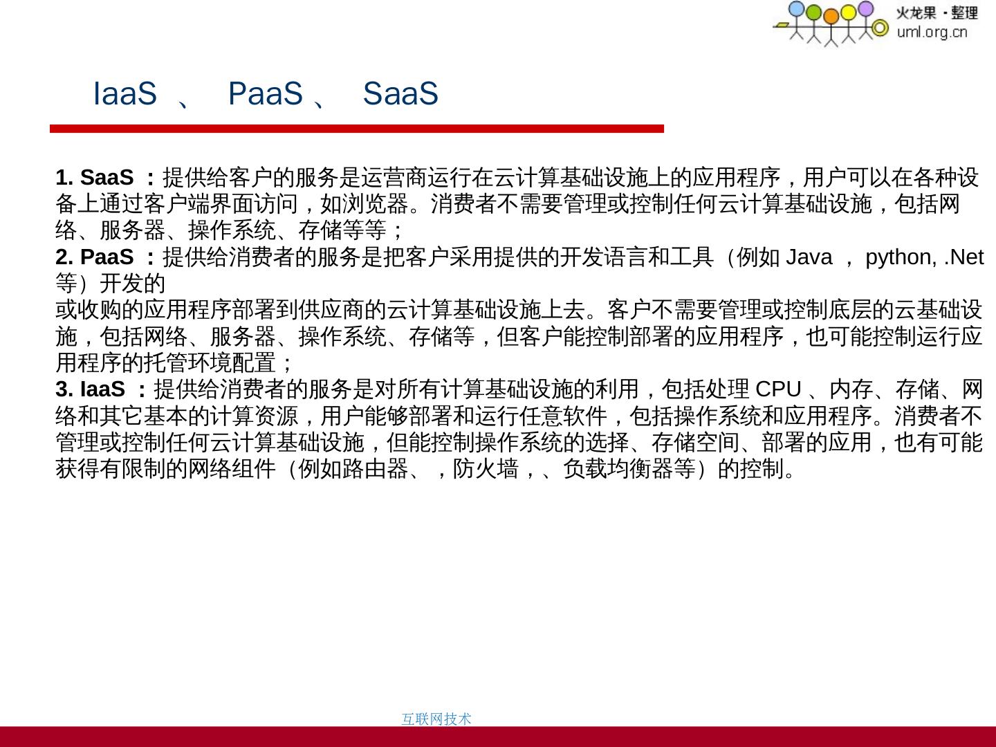 8 .IaaS 、 PaaS 、 SaaS 1. SaaS : 提供给客户的服务是运营商运行在云计算基础设施上的应用程序,用户可以在各种设备上通过客户端界面访问,如浏览器。消费者不需要管理或控制任何云计算基础设施,包括网络、服务器、操作系统、存储等等; 2. PaaS : 提供给消费者的服务是把客户采用提供的开发语言和工具(例如 Java , python, .Net 等)开发的 或收购的应用程序部署到供应商的云计算基础设施上去。客户不需要管理或控制底层的云基础设施,包括网络、服务器、操作系统、存储等,但客户能控制部署的应用程序,也可能控制运行应用程序的托管环境配置; 3. IaaS : 提供给消费者的服务是对所有计算基础设施的利用,包括处理 CPU 、内存、存储、网络和其它基本的计算资源,用户能够部署和运行任意软件,包括操作系统和应用程序。消费者不管理或控制任何云计算基础设施,但能控制操作系统的选择、存储空间、部署的应用,也有可能获得有限制的网络组件(例如路由器、,防火墙,、负载均衡器等)的控制。