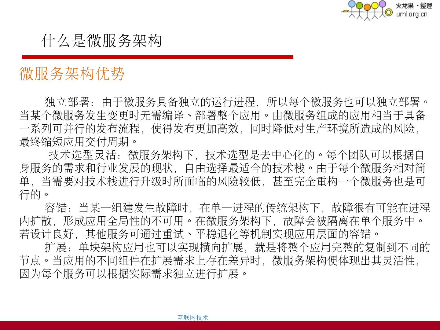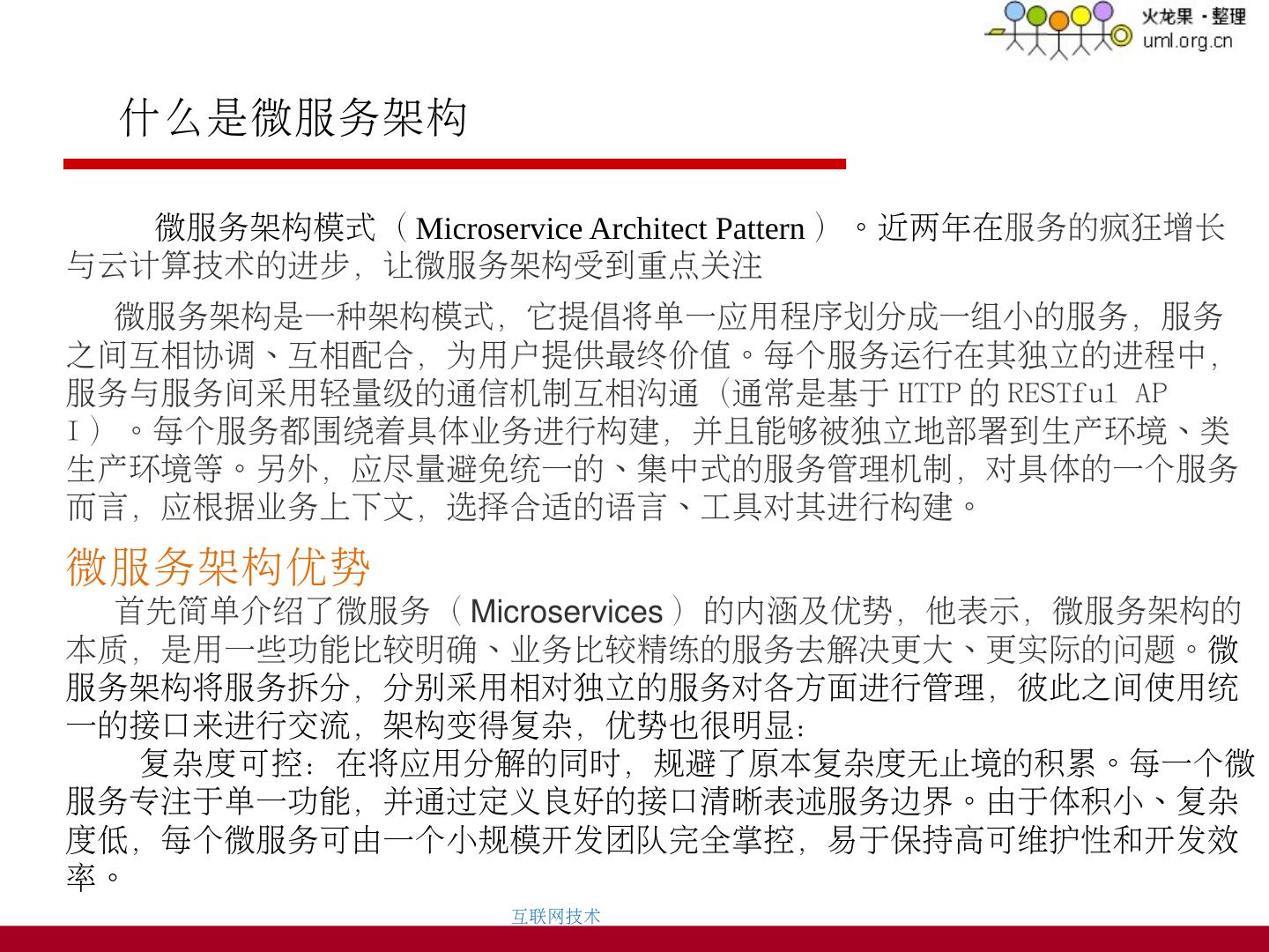 10 .什么是微服务架构 微 服务架构模式( Microservice Architect Pattern )。近 两年在 服务 的疯狂增长与云计算技术的进步,让微服务架构 受到重点 关注 微 服务架构是一种架构模式,它提倡将单一应用程序划分成一组小的服务,服务之间互相协调、互相配合,为用户提供最终价值。每个服务运行在其独立的进程中,服务与服务间采用轻量级的通信机制互相沟通(通常是基于 HTTP 的 RESTful API )。每个服务都围绕着具体业务进行构建,并且能够被独立地部署到生产环境、类生产环境等。另外,应尽量避免统一的、集中式的服务管理机制,对具体的一个服务而言,应根据业务上下文,选择合适的语言、工具对其进行构建。 微服务架构优势 首先 简单介绍了微服务( Microservices )的内涵及优势,他表示,微服务架构的本质,是用一些功能比较明确、业务比较精练的服务去解决更大、更实际的问题 。 微服务架构将服务拆分,分别采用相对独立的服务对各方面进行管理,彼此之间使用统一的接口来进行交流,架构变得复杂,优势也很明显 : 复杂 度可控 :在将应用分解的同时,规避了原本复杂度无止境的积累。每一个微服务专注于单一功能,并通过定义良好的接口清晰表述服务边界。由于体积小、复杂度低,每个微服务可由一个小规模开发团队完全掌控,易于保持高可维护性和开发效率。