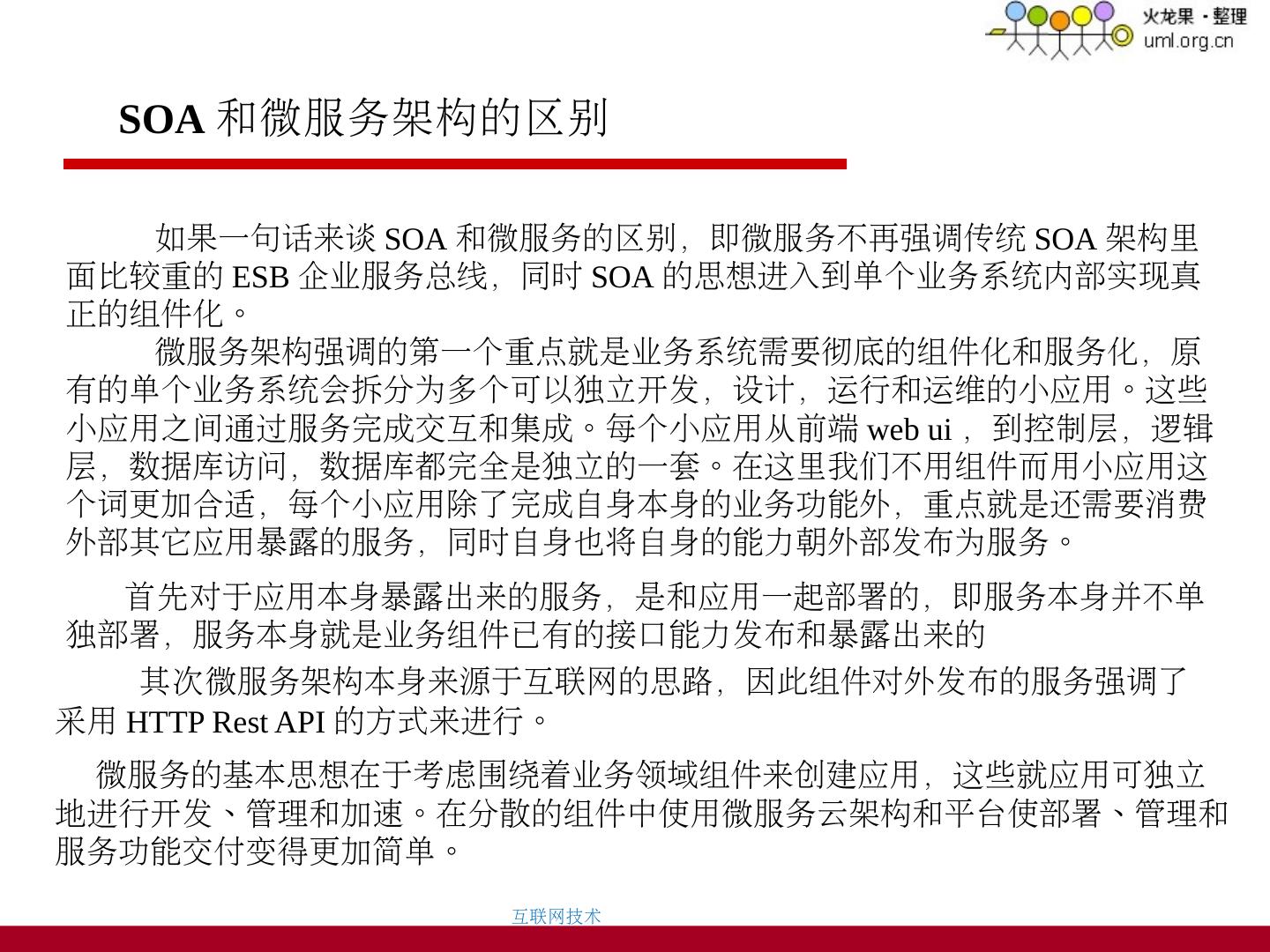 12 .SOA 和微服务架构的区别 如果 一句话来谈SOA和微服务的区别,即微服务不再强调传统SOA架构里面比较重的ESB企业服务总线,同时SOA的思想进入到单个业务系统内部实现真正的组件化。 微 服务架构强调的第一个重点就是业务系统需要彻底的组件化和服务化,原有的单个业务系统会拆分为多个可以独立开发,设计,运行和运维的小应用。这些小应用之间通过服务完成交互和集成。每个小应用从前端web ui,到控制层,逻辑层,数据库访问,数据库都完全是独立的一套。在这里我们不用组件而用小应用这个词更加合适,每个小应用除了完成自身本身的业务功能外,重点就是还需要消费外部其它应用暴露的服务,同时自身也将自身的能力朝外部发布为服务。 首先 对于应用本身暴露出来的服务,是和应用一起部署的,即服务本身并不单独部署,服务本身就是业务组件已有的接口能力发布和暴露出来的 其次 微 服务架构本身来源于互联网的思路,因此组件对外发布的服务强调了采用HTTP Rest API的方式来进行。 微 服务的基本思想在于考虑围绕着业务领域组件来创建应用,这些就应用可独立地进行开发、管理和加速。在分散的组件中使用微服务云架构和平台使部署、管理和服务功能交付变得更加简单。