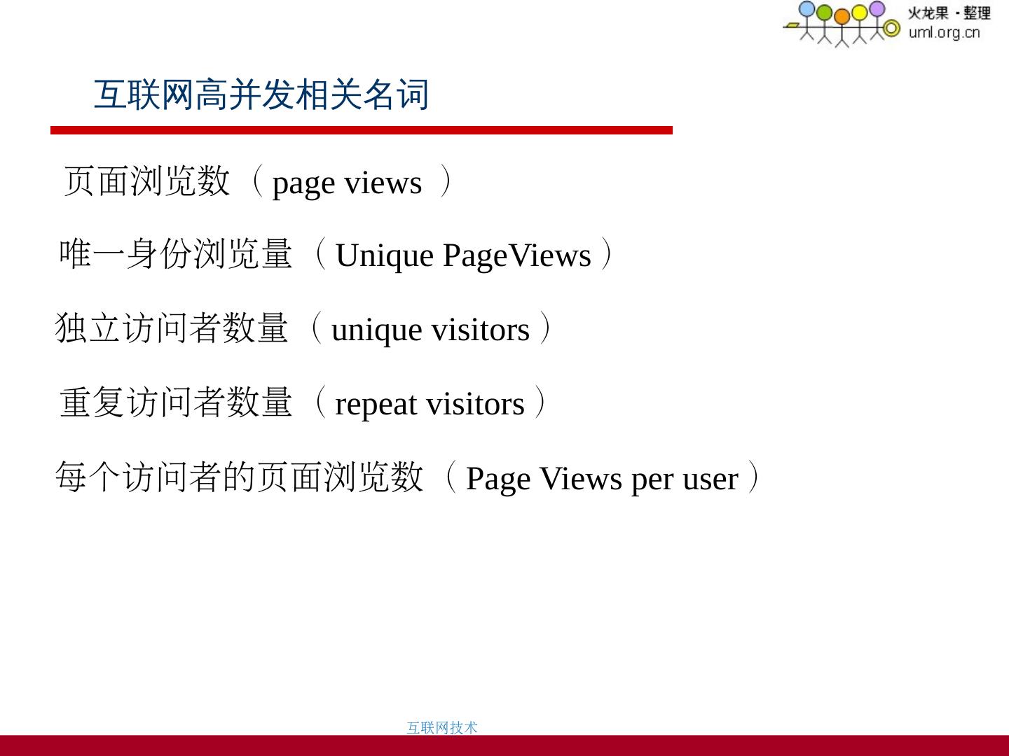13 .互联网高并发相关名词 页面 浏览数( page views ) 独立访问者数量( unique visitors ) 重复访问者数量( repeat visitors ) 每个访问者的页面浏览数( Page Views per user ) 唯一身份浏览量( Unique PageViews )