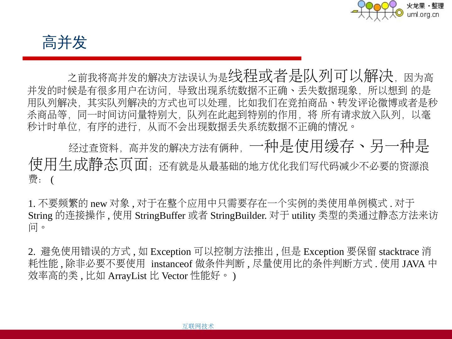 14 .高并发 之前 我将高并发的解决方法误认为是 线程或者是队列可以解决 ,因为高并发的时候是有很多用户在访问,导致出现系统数据不正确、丢失数据现象,所以想到 的是用队列解决,其实队列解决的方式也可以处理,比如我们在竞拍商品、转发评论微博或者是秒杀商品等,同一时间访问量特别大,队列在此起到特别的作用,将 所有请求放入队列,以毫秒计时单位,有序的进行,从而不会出现数据丢失系统数据不正确的情况。 经过 查资料,高并发的解决方法有俩种, 一种是使用缓存、另一种是使用生成静态页面 ;还有就是从最基础的地方优化我们写代码减少不必要的资源浪费:( 1.不要频繁的new对象,对于在整个应用中只需要存在一个实例的类使用单例模式.对于String的连接操作,使用StringBuffer或者StringBuilder.对于utility类型的类通过静态方法来访问。 2. 避免使用错误的方式,如Exception可以控制方法推出,但是Exception要保留stacktrace消耗性能,除非必要不要使用 instanceof做条件判断,尽量使用比的条件判断方式.使用JAVA中效率高的类,比如ArrayList比Vector性能好。)