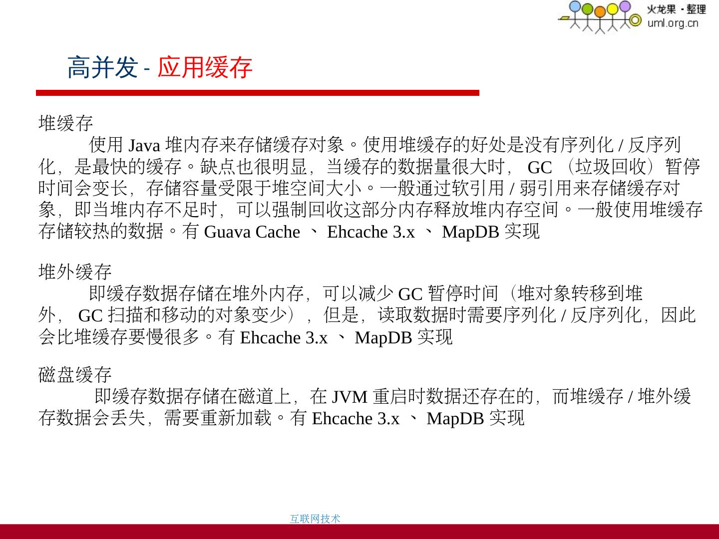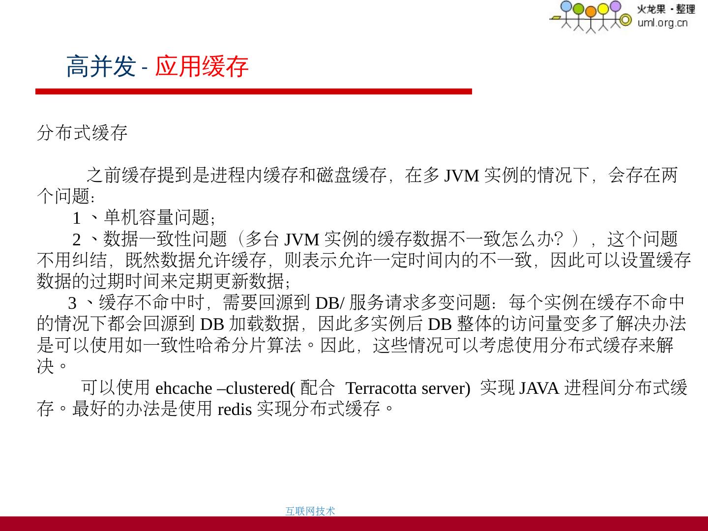17 .高并发 - 应用 缓存 分布式缓存 之前缓存提到是进程内缓存和磁盘缓存,在多 JVM 实例的情况下,会存在两个问题: 1 、单机容量问题; 2 、数据一致性问题(多台 JVM 实例的缓存数据不一致怎么办 ? ),这个问题不用纠结,既然数据允许缓存,则表示允许一定时间内的不一致,因此可以设置缓存数据的过期时间来定期更新数据; 3 、缓存不命中时,需要回源到 DB/ 服务请求多变问题:每个实例在缓存不命中的情况下都会回源到 DB 加载数据,因此多实例后 DB 整体的访问量变多了解决办法是可以使用如一致性哈希分片算法。因此,这些情况可以考虑使用分布式缓存来解决。 可以使用 ehcache –clustered( 配合 Terracotta server) 实现 JAVA 进程间分布式缓存。最好的办法是使用 redis 实现分布式缓存。