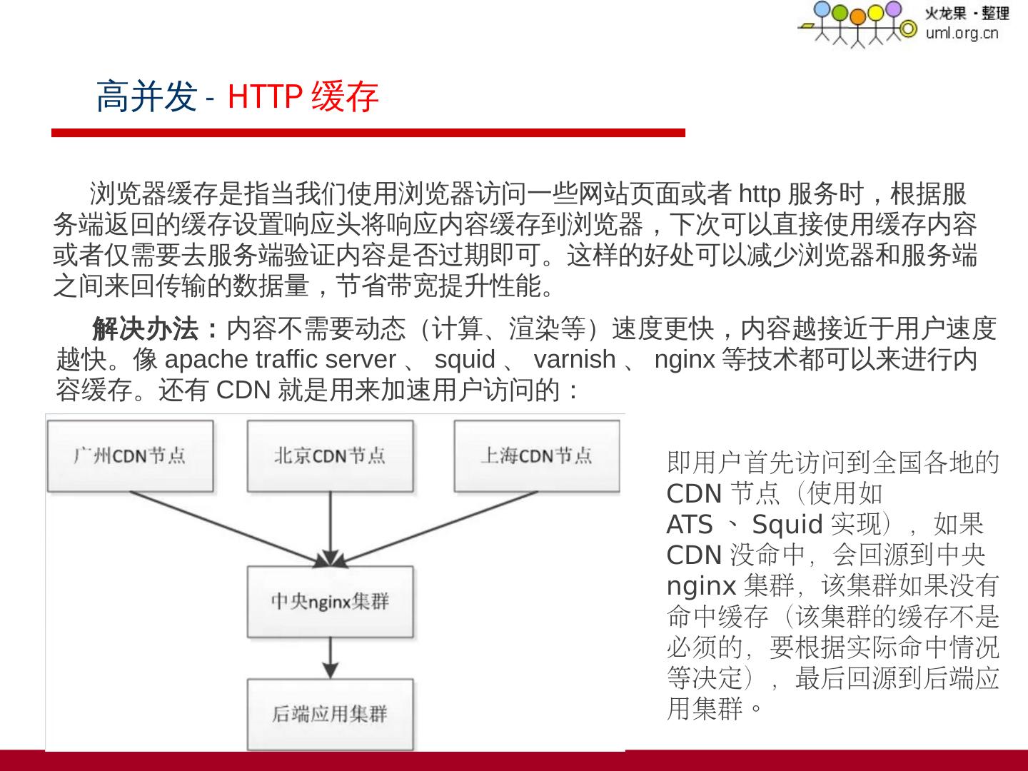 18 .高并发 - HTTP 缓存 浏览器 缓存是指当我们使用浏览器访问一些网站页面或者 http 服务时,根据服务端返回的缓存设置响应头将响应内容缓存到浏览器,下次可以直接使用缓存内容或者仅需要去服务端验证内容是否过期即可。这样的好处可以减少浏览器和服务端之间来回传输的数据量,节省带宽提升性能。 解决办法: 内容 不需要动态(计算、渲染等)速度更快,内容越接近于用户速度越快。像 apache traffic server 、 squid 、 varnish 、 nginx 等技术都可以来进行内容缓存。还有 CDN 就是用来加速用户访问的: 即用户首先访问到全国各地的 CDN 节点(使用如 ATS 、 Squid 实现),如果 CDN 没命中,会回源到中央 nginx 集群,该集群如果没有命中缓存(该集群的缓存不是必须的,要根据实际命中情况等决定),最后回源到后端应用集群。