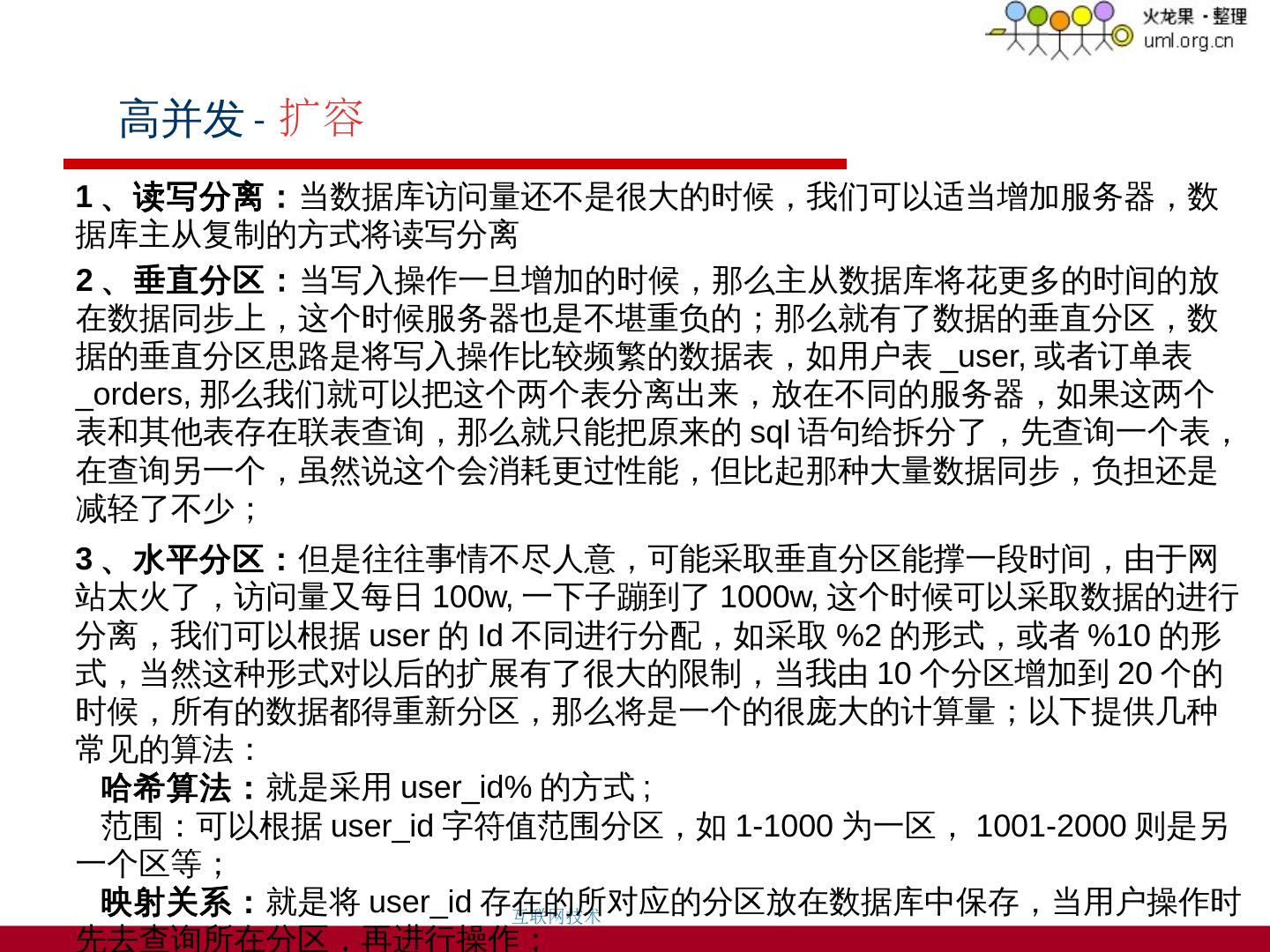 21 .高并发 - 扩容 1 、读写分离: 当数据库访问量还不是很大的时候,我们可以适当增加服务器,数据库主从复制的方式将读写分离 2 、垂直分区: 当写入操作一旦增加的时候,那么主从数据库将花更多的时间的放在数据同步上,这个时候服务器也是不堪重负的;那么就有了数据的垂直分区,数据的垂直分区思路是将写入操作比较频繁的数据表,如用户表 _user, 或者订单表 _orders, 那么我们就可以把这个两个表分离出来,放在不同的服务器,如果这两个表和其他表存在联表查询,那么就只能把原来的 sql 语句给拆分了,先查询一个表,在查询另一个,虽然说这个会消耗更过性能,但比起那种大量数据同步,负担还是减轻了不少; 3 、水平分区: 但是往往事情不尽人意,可能采取垂直分区能撑一段时间,由于网站太火了,访问量又每日 100w, 一下子蹦到了 1000w, 这个时候可以采取数据的进行分离,我们可以根据 user 的 Id 不同进行分配,如采取 %2 的形式,或者 %10 的形式,当然这种形式对以后的扩展有了很大的限制,当我由 10 个分区增加到 20 个的时候,所有的数据都得重新分区,那么将是一个的很庞大的计算量;以下提供几种常见的算法: 哈希算法: 就是采用 user_id % 的方式 ; 范围:可以根据 user_id 字符值范围分区,如 1-1000 为一区, 1001-2000 则是另一个区等; 映射关系: 就是将 user_id 存在的所对应的分区放在数据库中保存,当用户操作时先去查询所在分区,再进行操作;