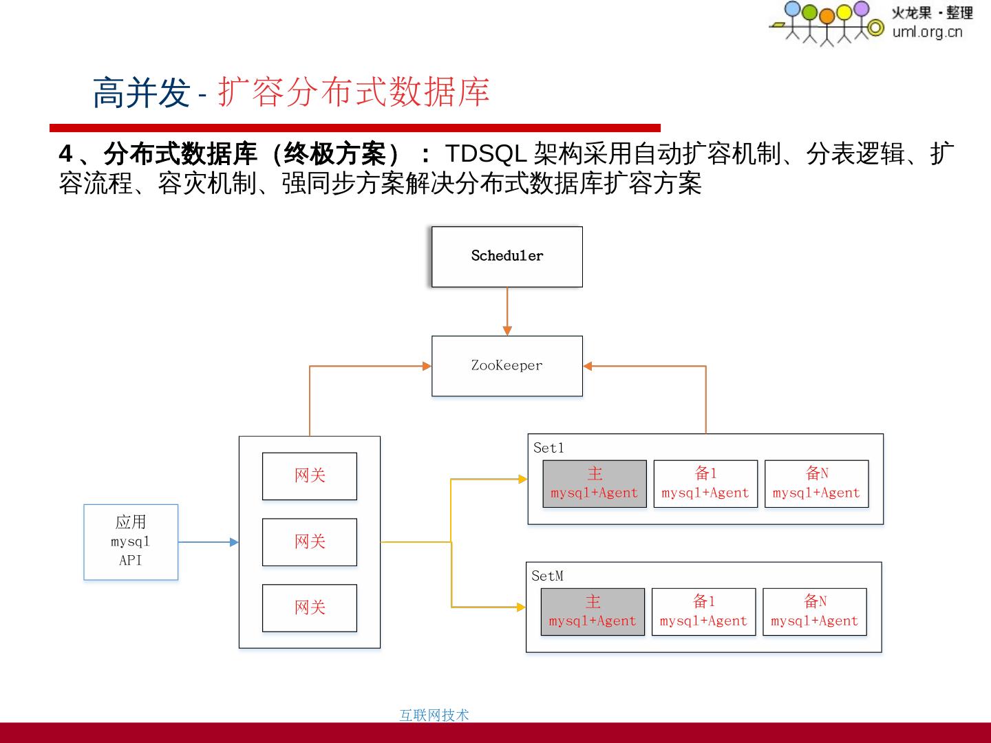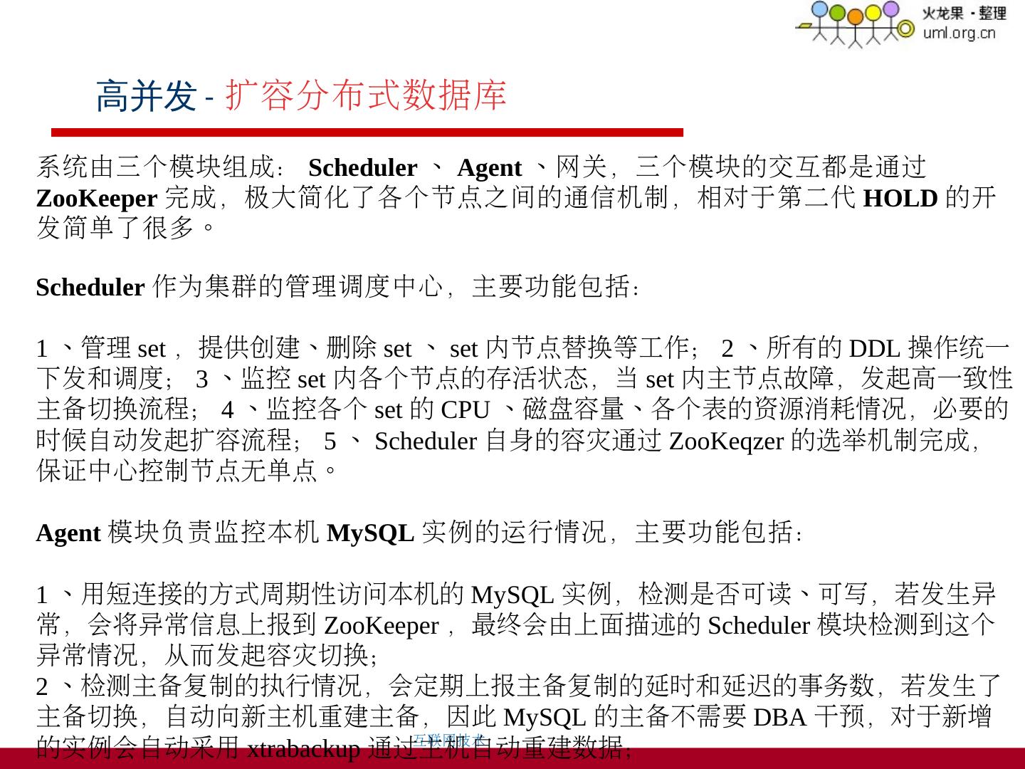 23 .高并发 - 扩容分布式数据库 系统由三个模块组成:Scheduler、Agent、网关,三个模块的交互都是通过ZooKeeper完成,极大简化了各个节点之间的通信机制,相对于第二代HOLD的开发简单了很多。 Scheduler作为集群的管理调度中心,主要功能包括: 1 、管理 set,提供创建、删除set、set内节点替换等工作 ; 2 、所有 的DDL操作统一下发和调度 ; 3 、监控 set内各个节点的存活状态,当set内主节点故障,发起高一致性主备切换流程 ; 4 、监控 各个set的CPU、磁盘容量、各个表的资源消耗情况,必要的时候自动发起扩容流程 ; 5 、Scheduler 自身的容灾通过ZooKeqzer的选举机制完成,保证中心控制节点无单点 。 Agent模块负责监控本机MySQL实例的运行情况,主要功能包括: 1 、用 短连接的方式周期性访问本机的MySQL实例,检测是否可读、可写,若发生异常,会将异常信息上报到ZooKeeper,最终会由上面描述的Scheduler模块检测到这个异常情况,从而发起容灾切换 ; 2 、检测 主备复制的执行情况,会定期上报主备复制的延时和延迟的事务数,若发生了主备切换,自动向新主机重建主备,因此MySQL的主备不需要DBA干预,对于新增的实例会自动采用xtrabackup通过主机自动重建数据 ;