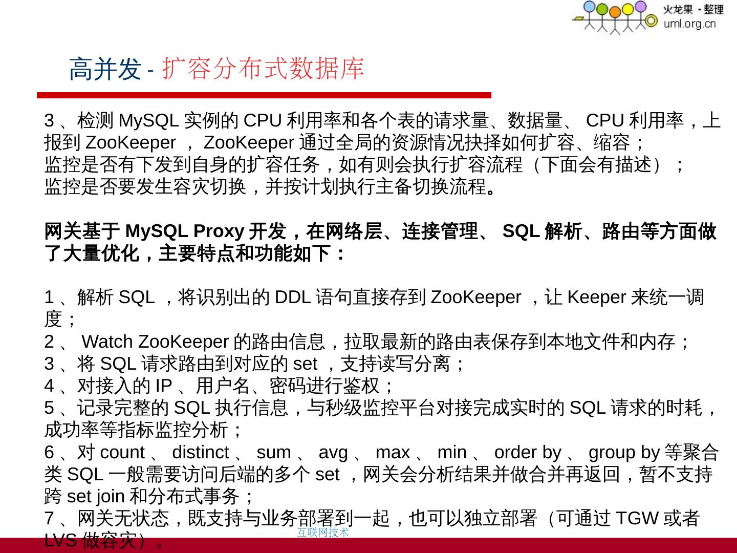 24 .高并发 - 扩容分布式数据库 3 、检测 MySQL实例的CPU利用率和各个表的请求量、数据量、CPU利用率,上报到ZooKeeper,ZooKeeper通过全局的资源情况抉择如何扩容、缩容 ; 监控是否有下发到自身的扩容任务,如有则会执行扩容流程(下面会有描述); 监控是否要发生容灾切换,并按计划执行主备切换流程 。 网关基于MySQL Proxy开发,在网络层、连接管理、SQL解析、路由等方面做了大量优化,主要特点和功能如下: 1 、解析SQL,将识别出的DDL语句直接存到ZooKeeper,让Keeper来统一调度; 2 、Watch ZooKeeper的路由信息,拉取最新的路由表保存到本地文件和内存; 3 、将SQL请求路由到对应的set,支持读写分离; 4 、对接入的IP、用户名、密码进行鉴权; 5 、记录完整的SQL执行信息,与秒级监控平台对接完成实时的SQL请求的时耗,成功率等指标监控分析; 6 、对count、distinct、sum、avg、max、min、order by、group by等聚合类SQL一般需要访问后端的多个set,网关会分析结果并做合并再返回,暂不支持跨set join和分布式事务; 7 、网关无状态,既支持与业务部署到一起,也可以独立部署(可通过TGW或者LVS做容灾)。