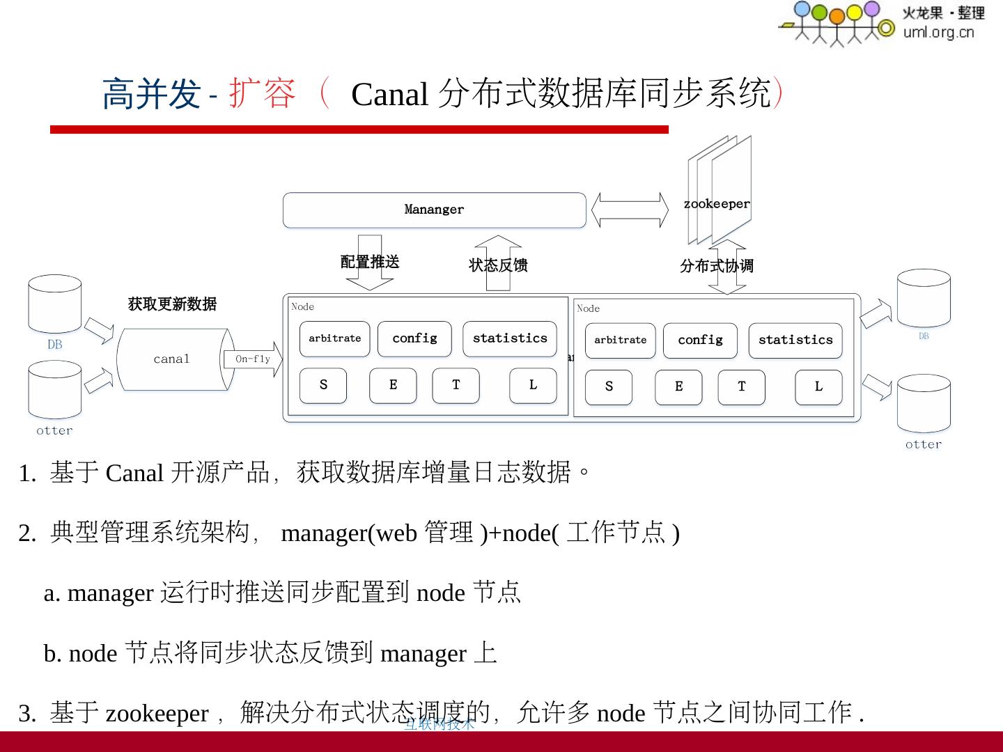 25 .高并发 - 扩容( Canal 分布式数据库同步 系统 ) 1. 基于Canal开源产品,获取数据库增量日志数据。 2. 典型管理系统架构,manager(web管理)+node(工作节点) a. manager运行时推送同步配置到node节点 b. node节点将同步状态反馈到manager上 3. 基于zookeeper,解决分布式状态调度的,允许多node节点之间协同工作.
