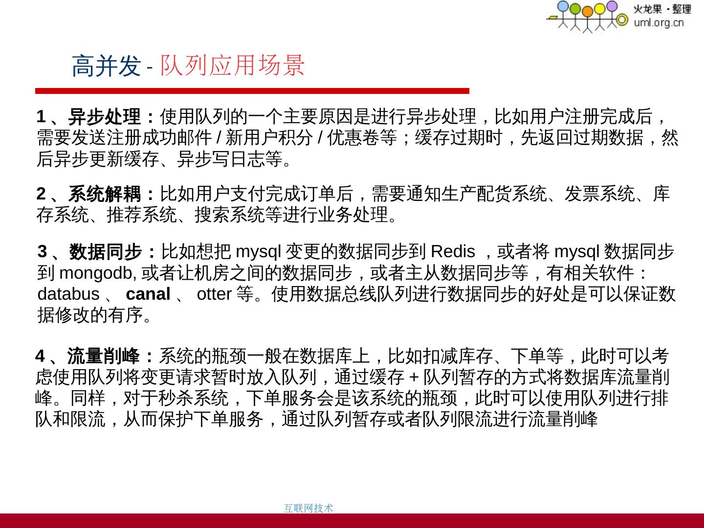 26 .高并发 - 队列应用场景 1 、异步处理: 使用队列的一个主要原因是进行异步处理,比如用户注册完成后,需要发送注册成功邮件 / 新用户积分 / 优惠卷等;缓存过期时,先返回过期数据,然后异步更新缓存、异步写日志等。 2 、系统解耦: 比如用户支付完成订单后,需要通知生产配货系统、发票系统、库存系统、推荐系统、搜索系统等进行业务处理。 3 、数据 同步 : 比如想把 mysql 变更的数据同步到 Redis ,或者将 mysql 数据同步到 mongodb , 或者让机房之间的数据同步,或者主从数据同步等,有相关软件: databus 、 canal 、 otter 等。使用数据总线队列进行数据同步的好处是可以保证数据修改的有序。 4 、流量削峰: 系统的瓶颈一般在数据库上,比如扣减库存、下单等,此时可以考虑使用队列将变更请求暂时放入队列,通过缓存 + 队列暂存的方式将数据库流量削峰。同样,对于秒杀系统,下单服务会是该系统的瓶颈,此时可以使用队列进行排队和限流,从而保护下单服务,通过队列暂存或者队列限流进行流量削峰