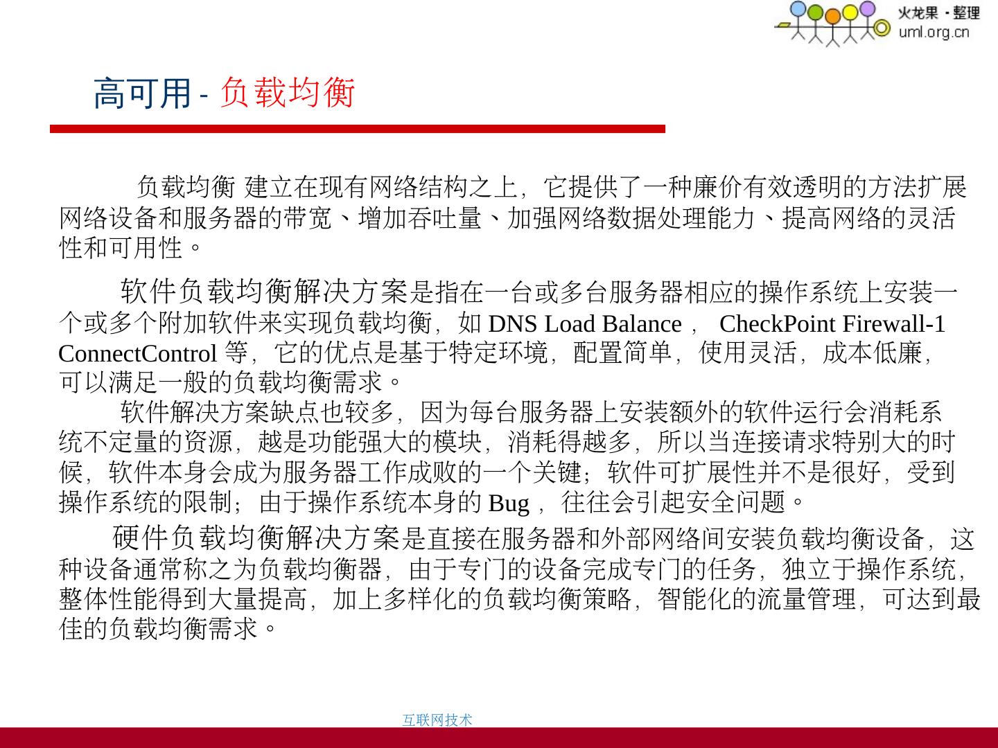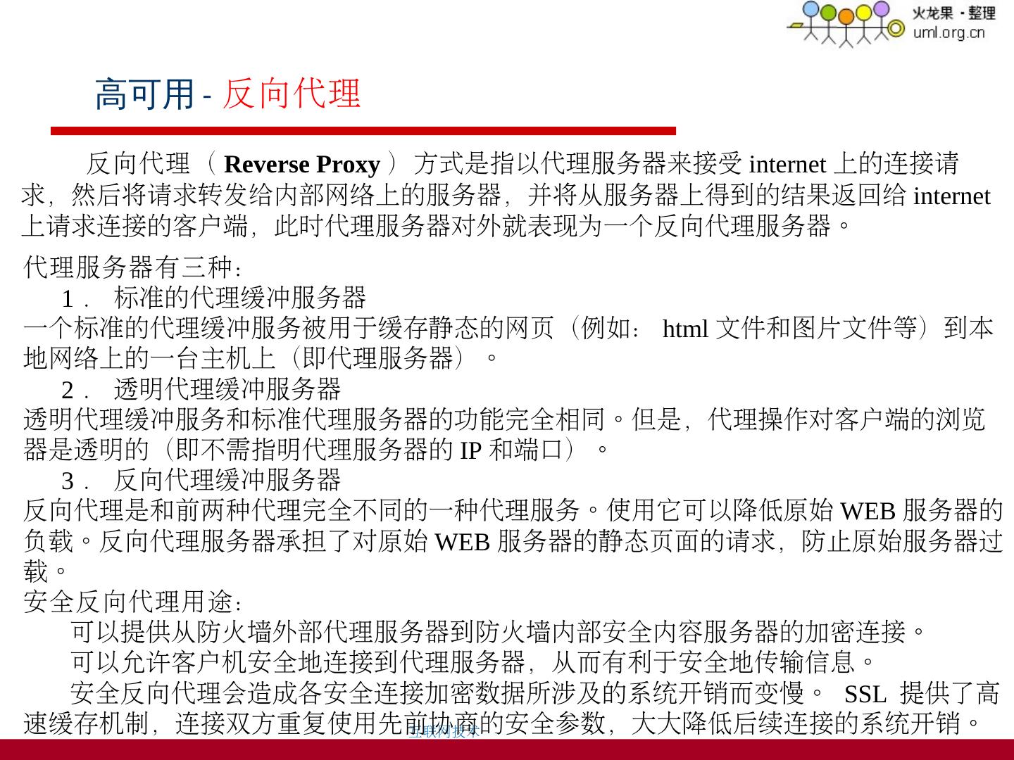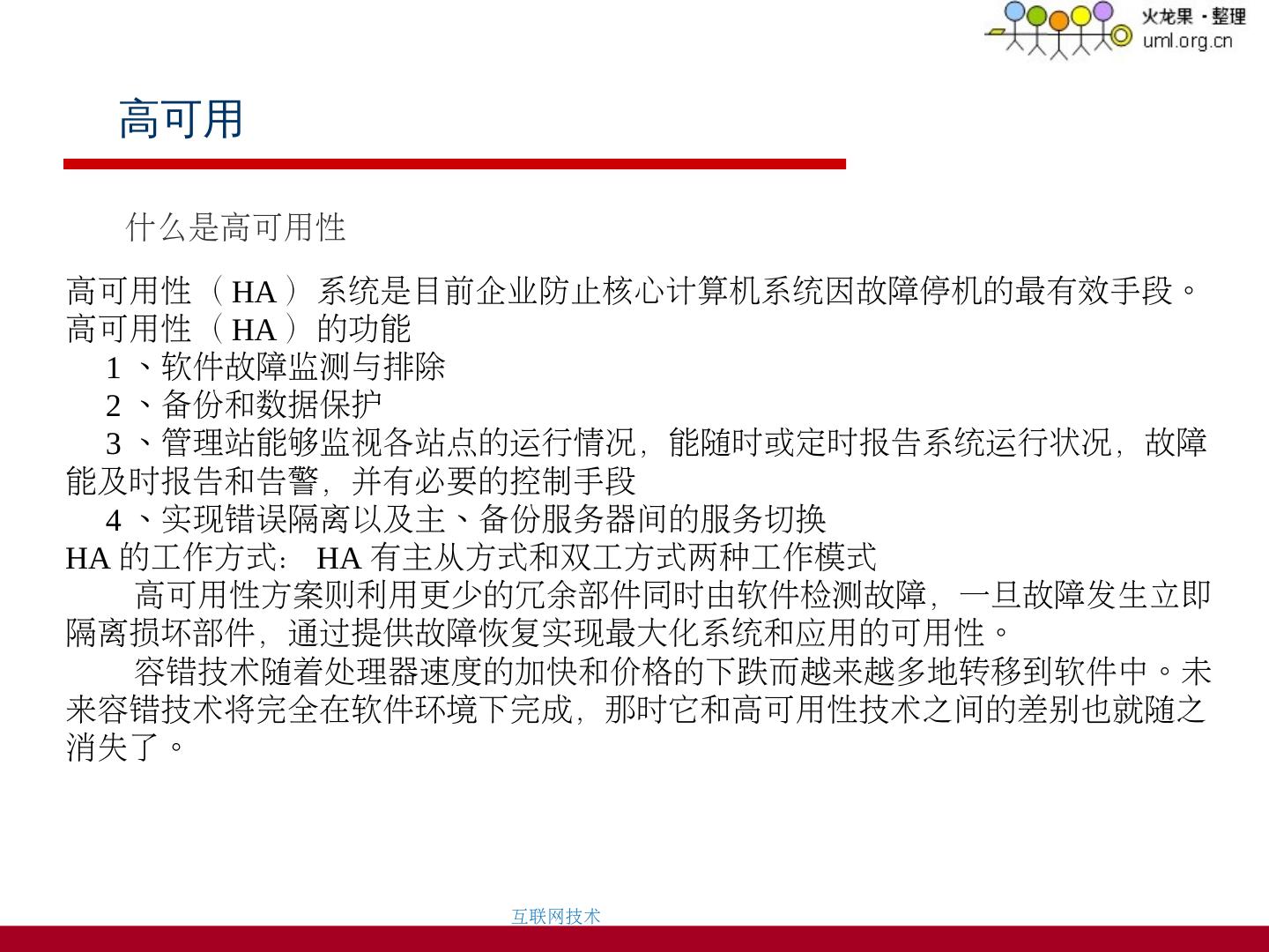 28 .高 可用 什么是高可用性 高可用性(HA) 系统 是目前企业防止核心计算机系统因故障停机的最有效手段。 高可用性(HA)的功能 1 、软件故障监测与排除 2 、备份和数据保护 3 、管理站能够监视各站点的运行情况,能随时或定时报告系统运行状况,故障能及时报告和告警,并有必要的控制手段 4、 实现错误隔离以及主、备份服务器间的服务切换 HA的工作 方式: HA有主从方式和双工方式两种工作模式 高 可用性方案则利用更少的冗余部件同时由软件检测故障,一旦故障发生立即隔离损坏部件,通过提供故障恢复实现最大化系统和应用的可用性。 容错 技术随着处理器速度的加快和价格的下跌而越来越多地转移到软件中。未来容错技术将完全在软件环境下完成,那时它和高可用性技术之间的差别也就随之消失了。
