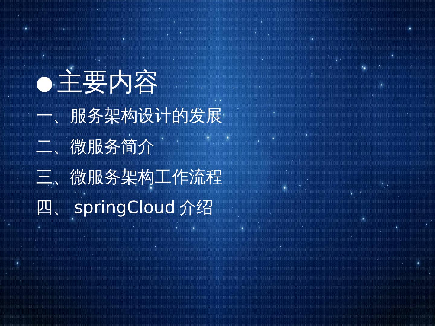 2 .● 主要内容 一、服务架构设计的发展 二、微服务简介 三、微服务架构工作流程 四、 springCloud 介绍