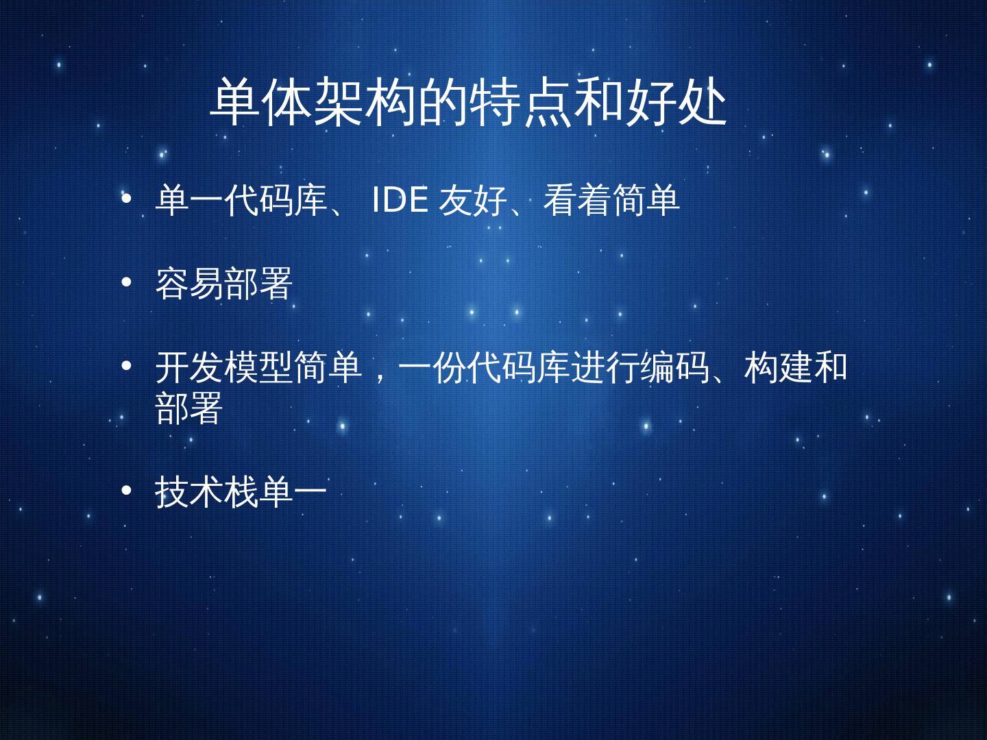 5 .单一代码库、 IDE 友好、看着简单 容易部署 开发模型简单,一份代码库进行编码、构建和部署 技术栈单一 单体架构的特点和好处