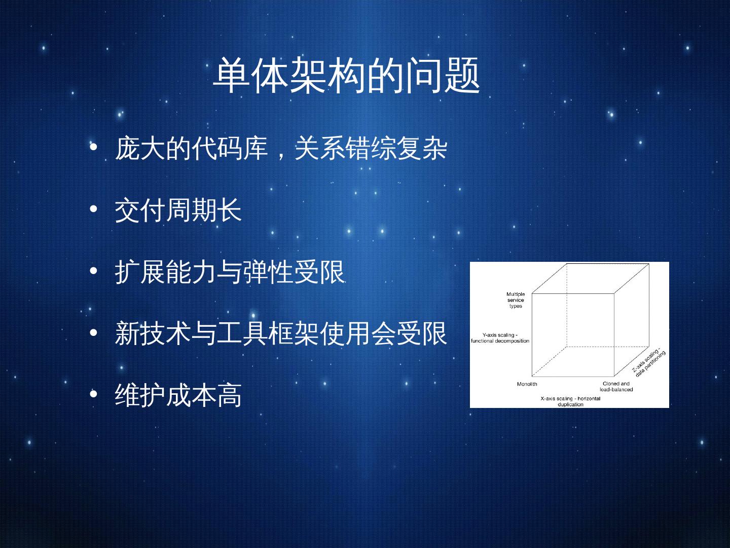 6 .庞大的代码库,关系错综复杂 交付周期长 扩展能力与弹性受限 新技术与工具框架使用会受限 维护成本高 单体架构的问题